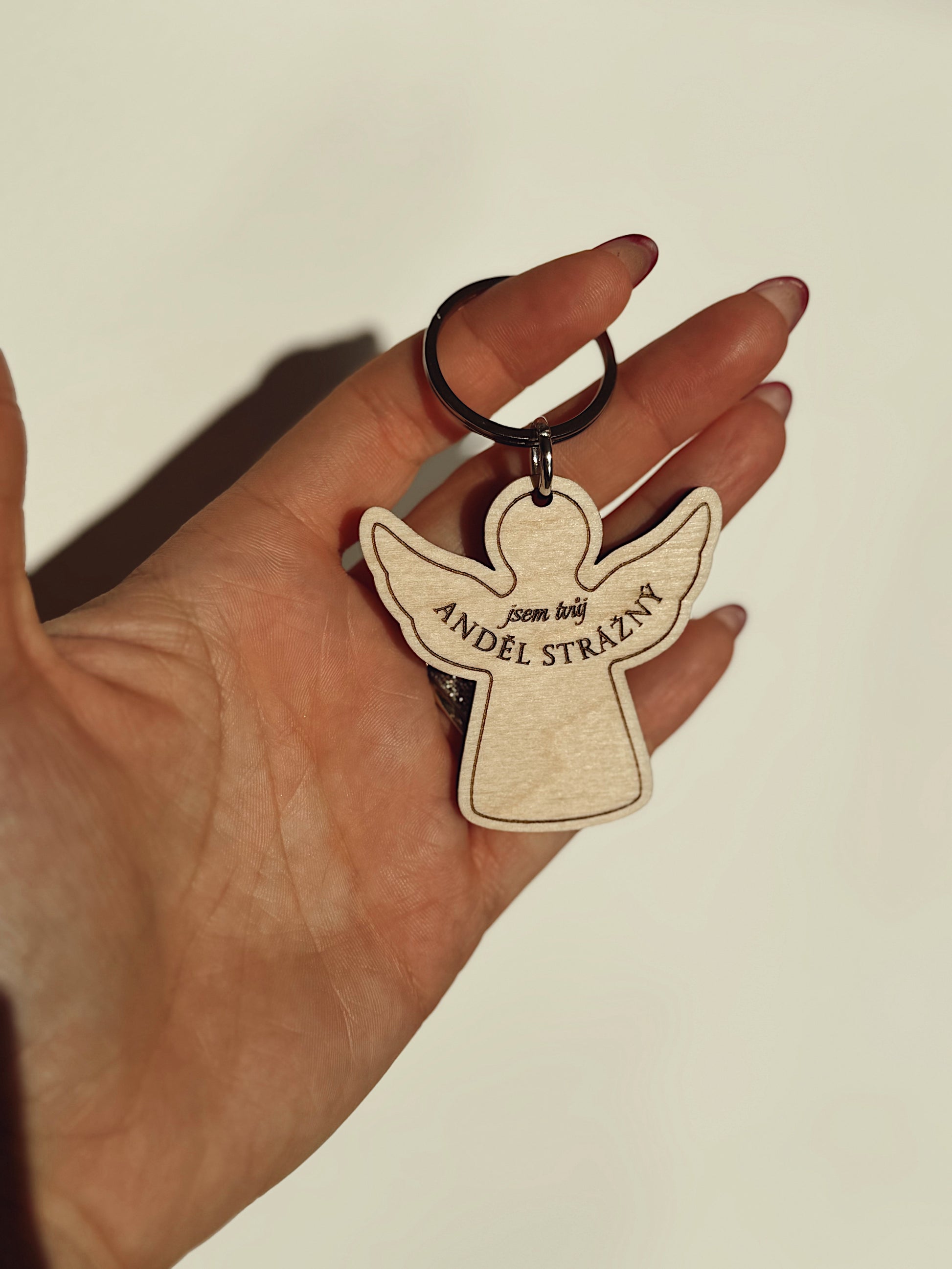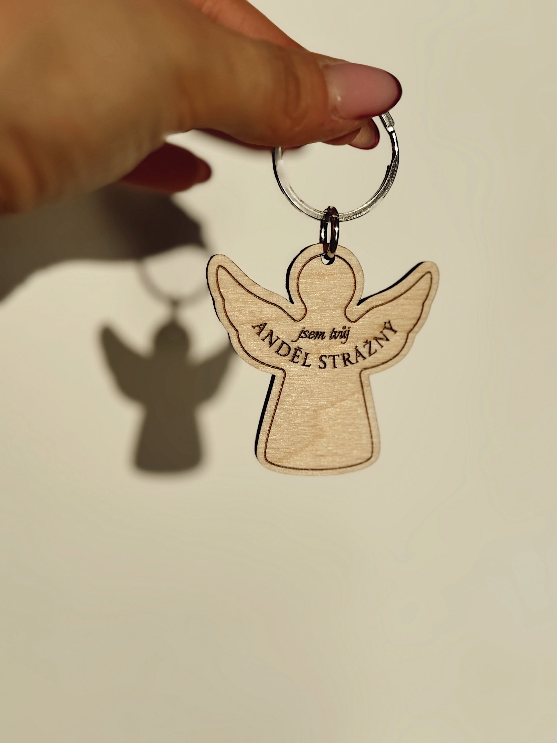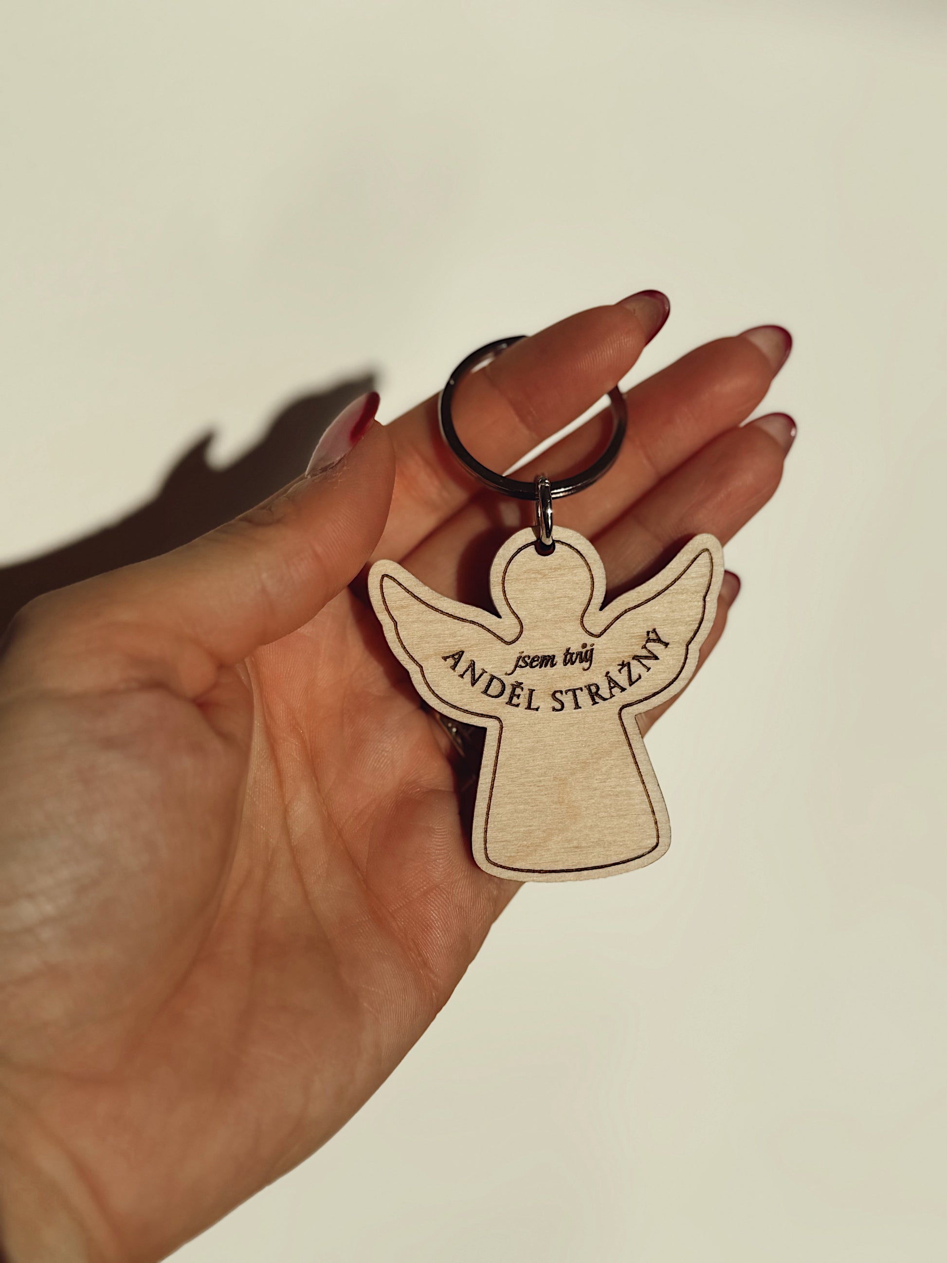 Dřevěný přívěsek Anděl strážný je malý talisman, který si můžete pověsit na klice, do auta nebo třeba na kabelku. Vhodný jako dárek milující osobě.