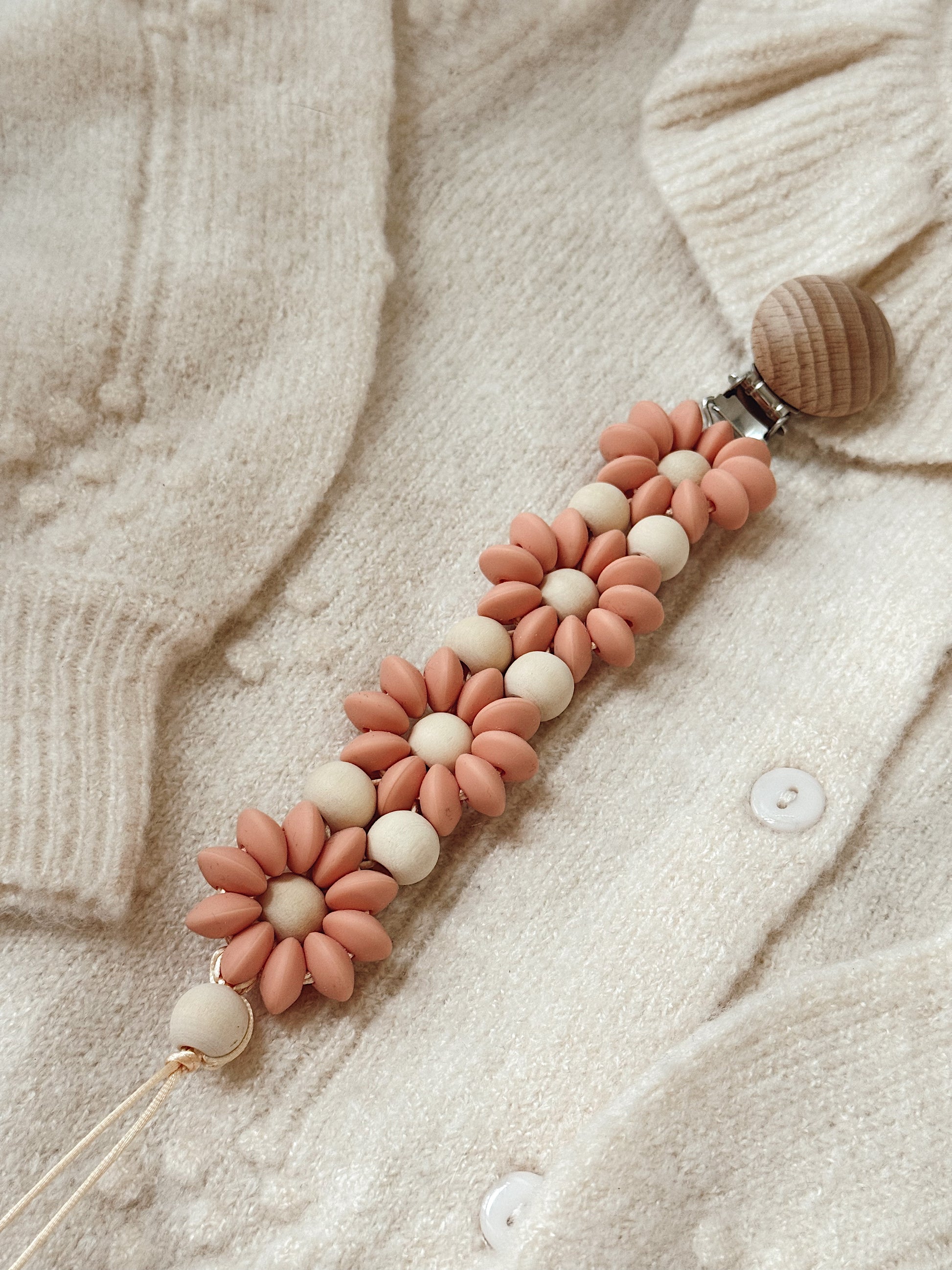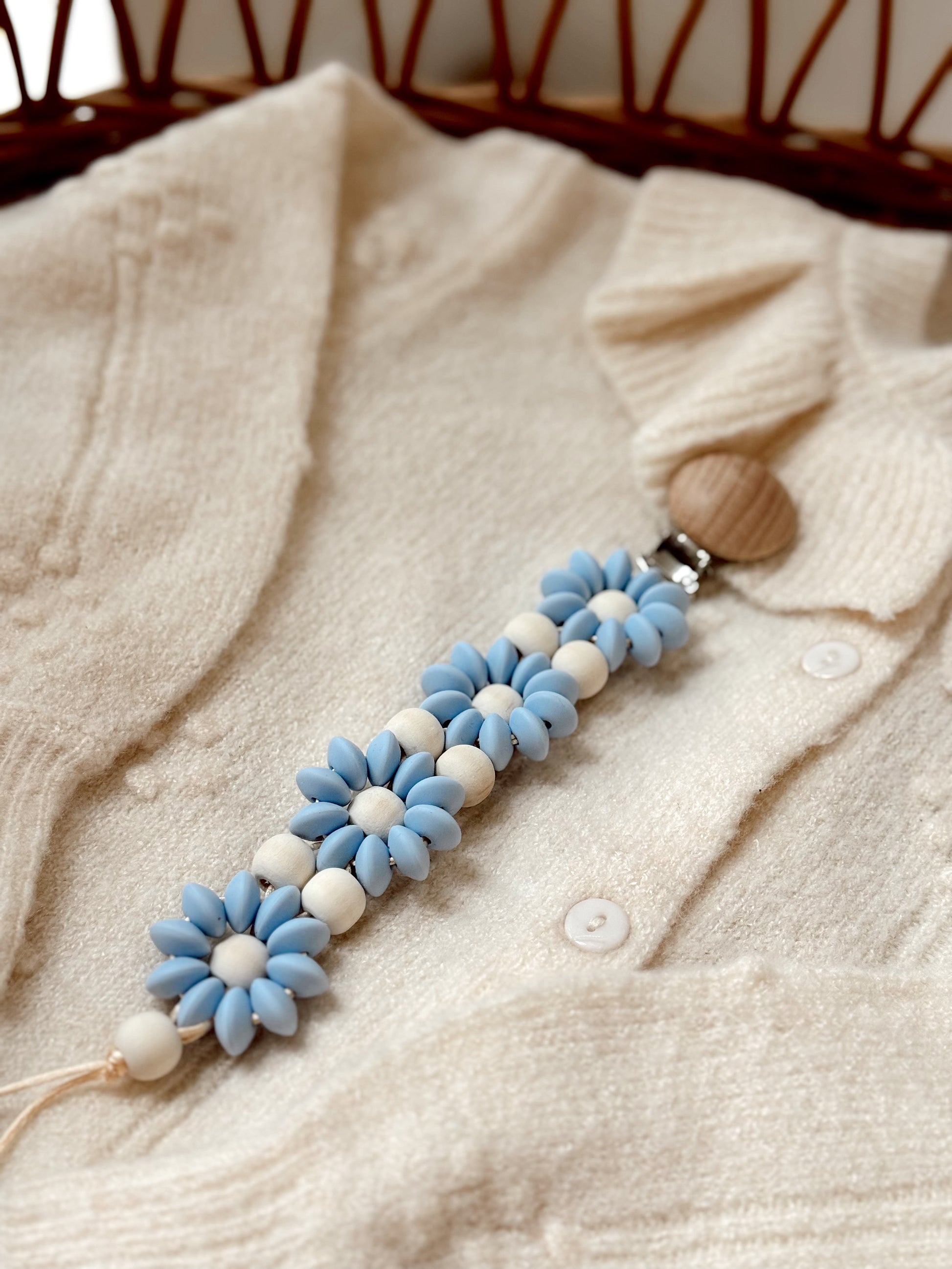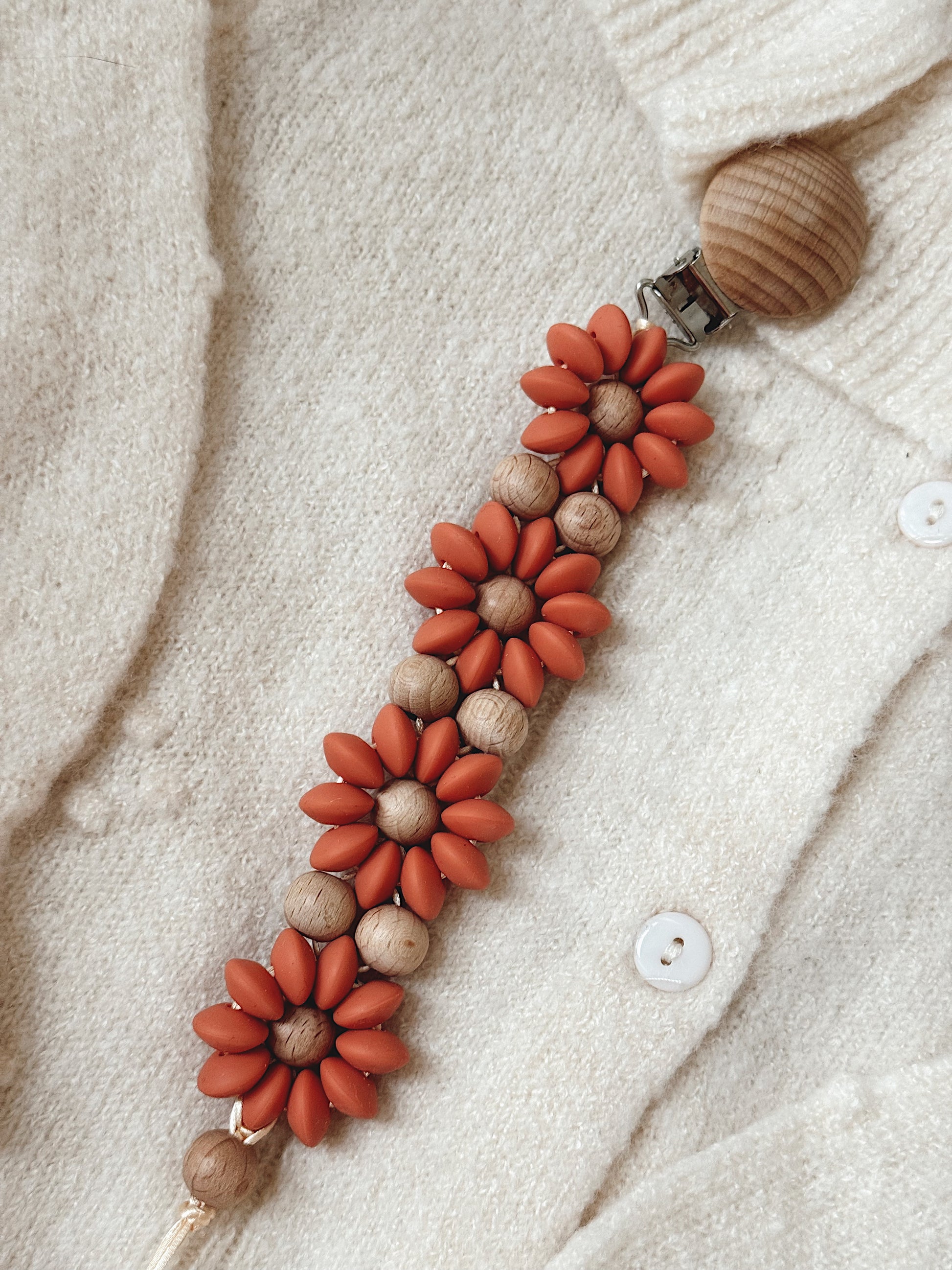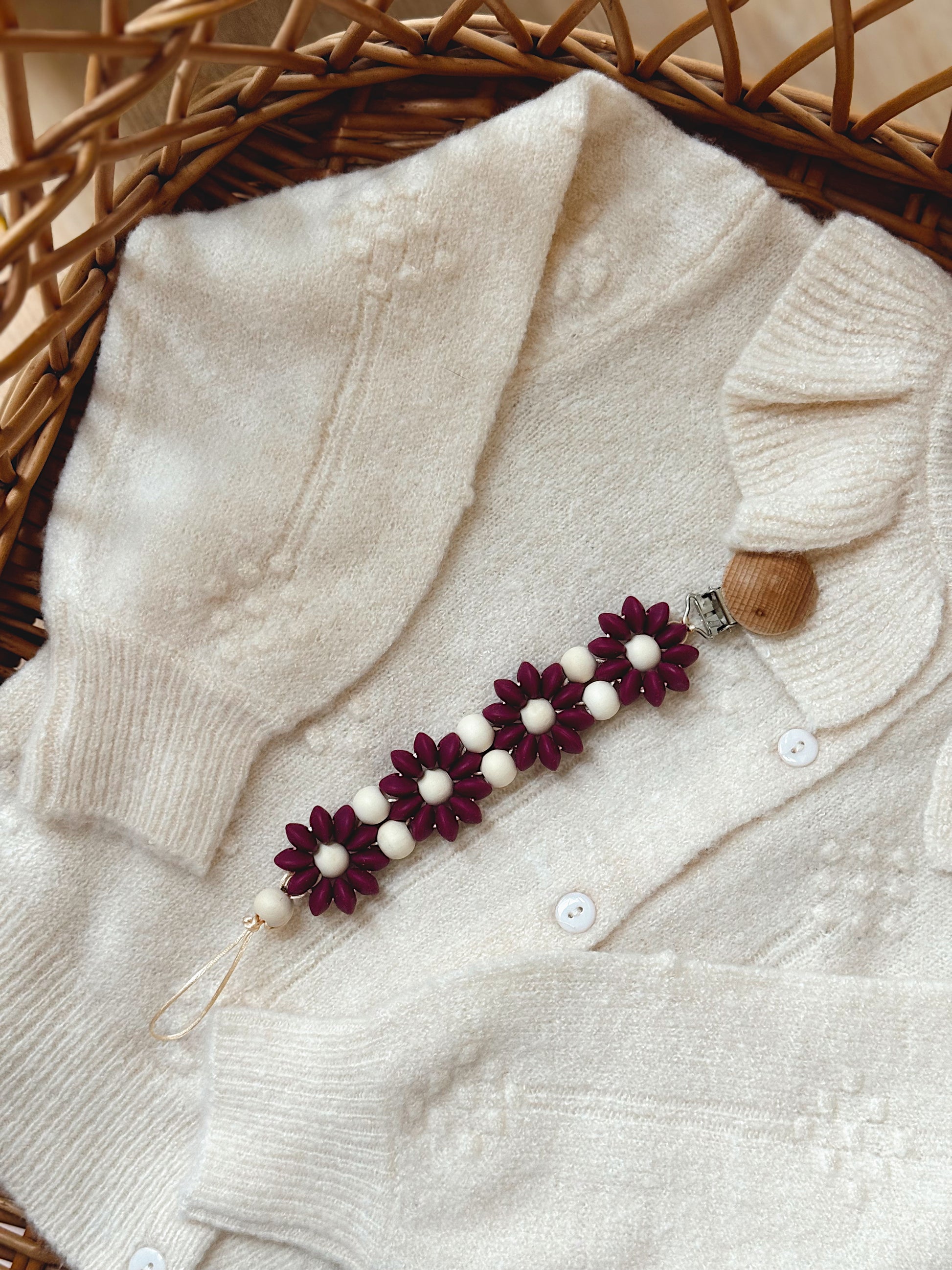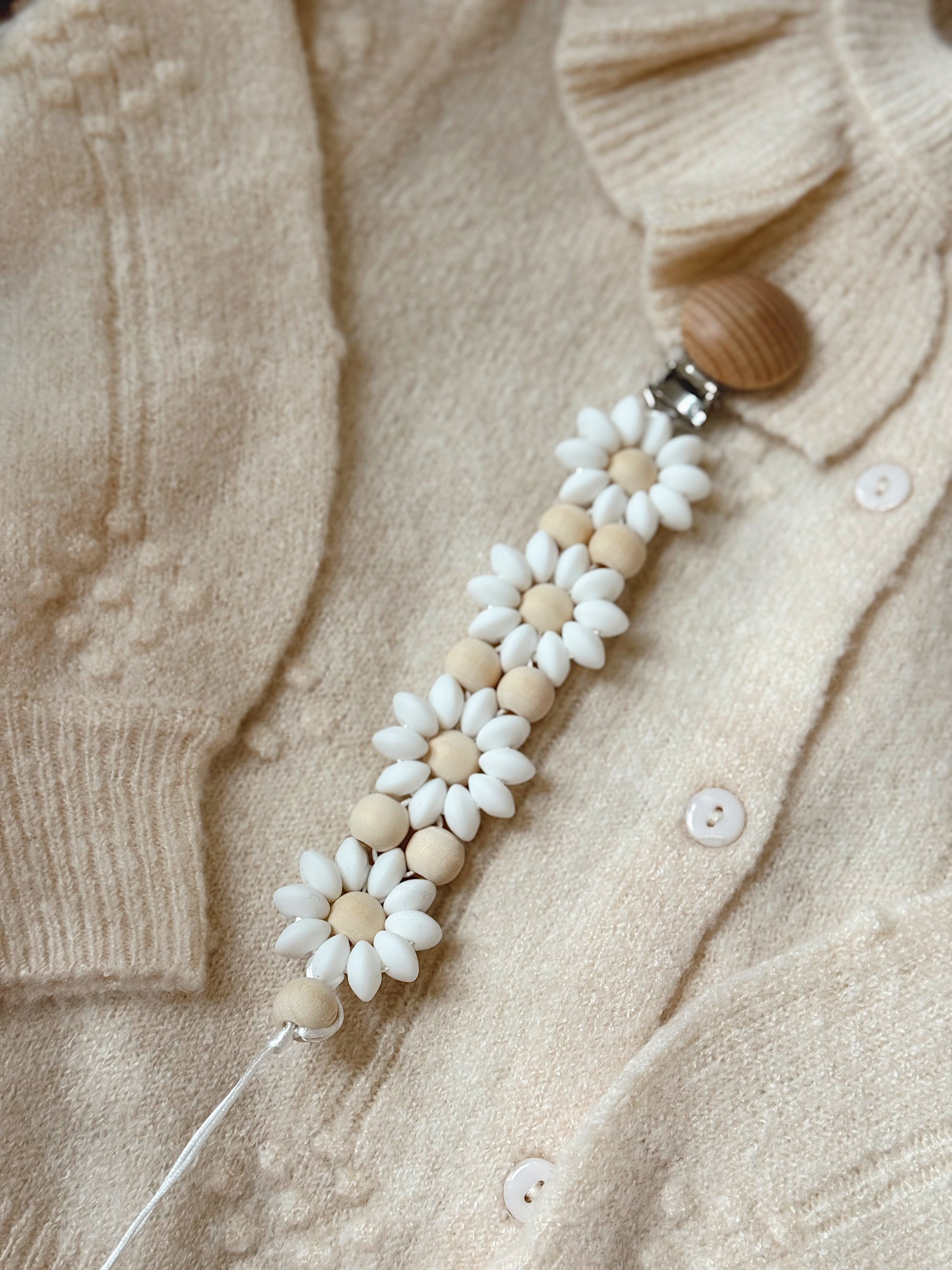 Klip na dudlík s kopretinou je ručně vyrobený přívěšek v kombinaci netoxických silikonových a dřevěných korálků. Stylový doplněk a zároveň praktický pomocník. Díky jemným barvám a přírodnímu dřevu se hodí ke každému outfitu i kočárku. Zabraňuje pádu dudlíku na zem a je ideální na procházky i doma.