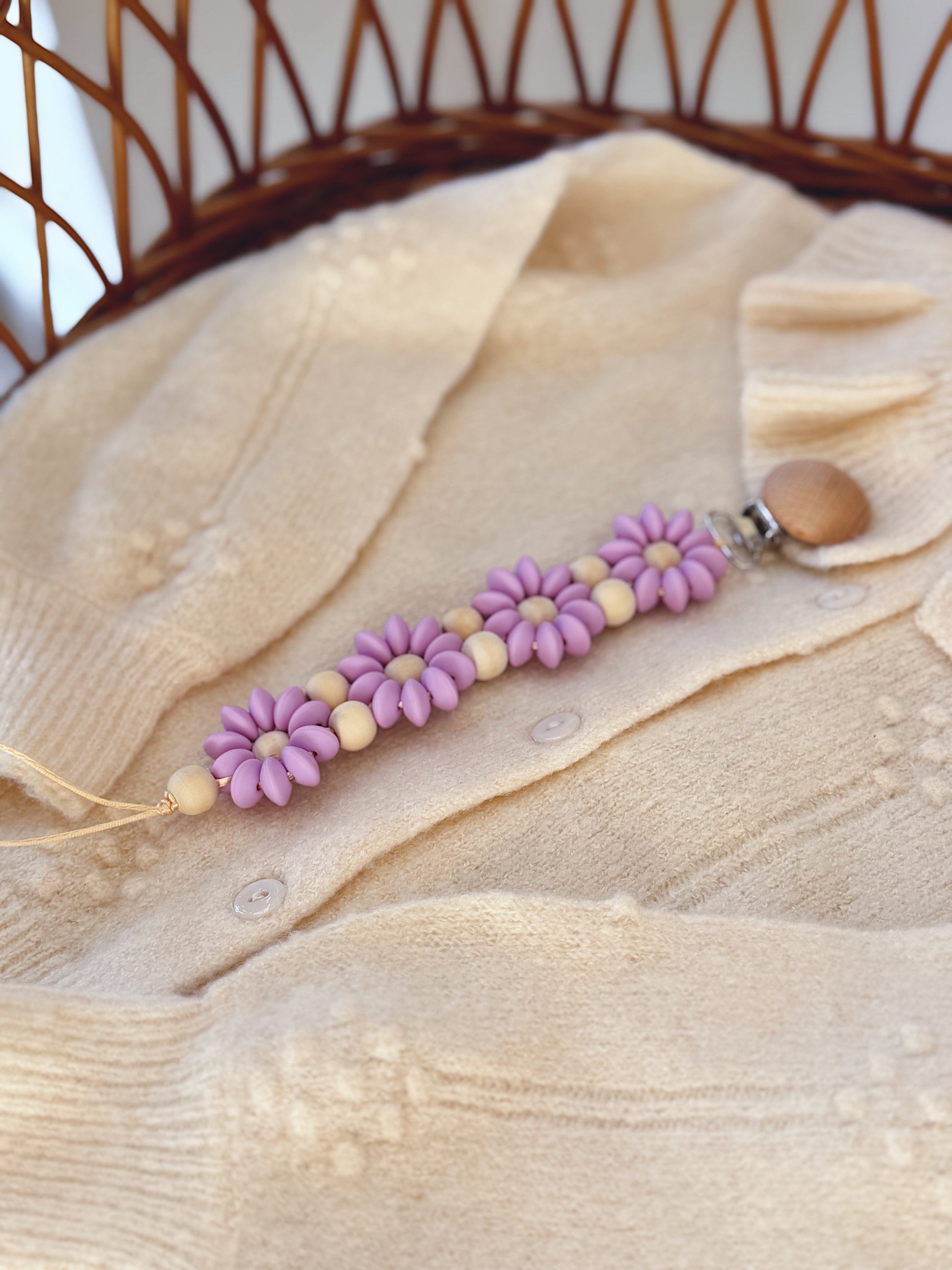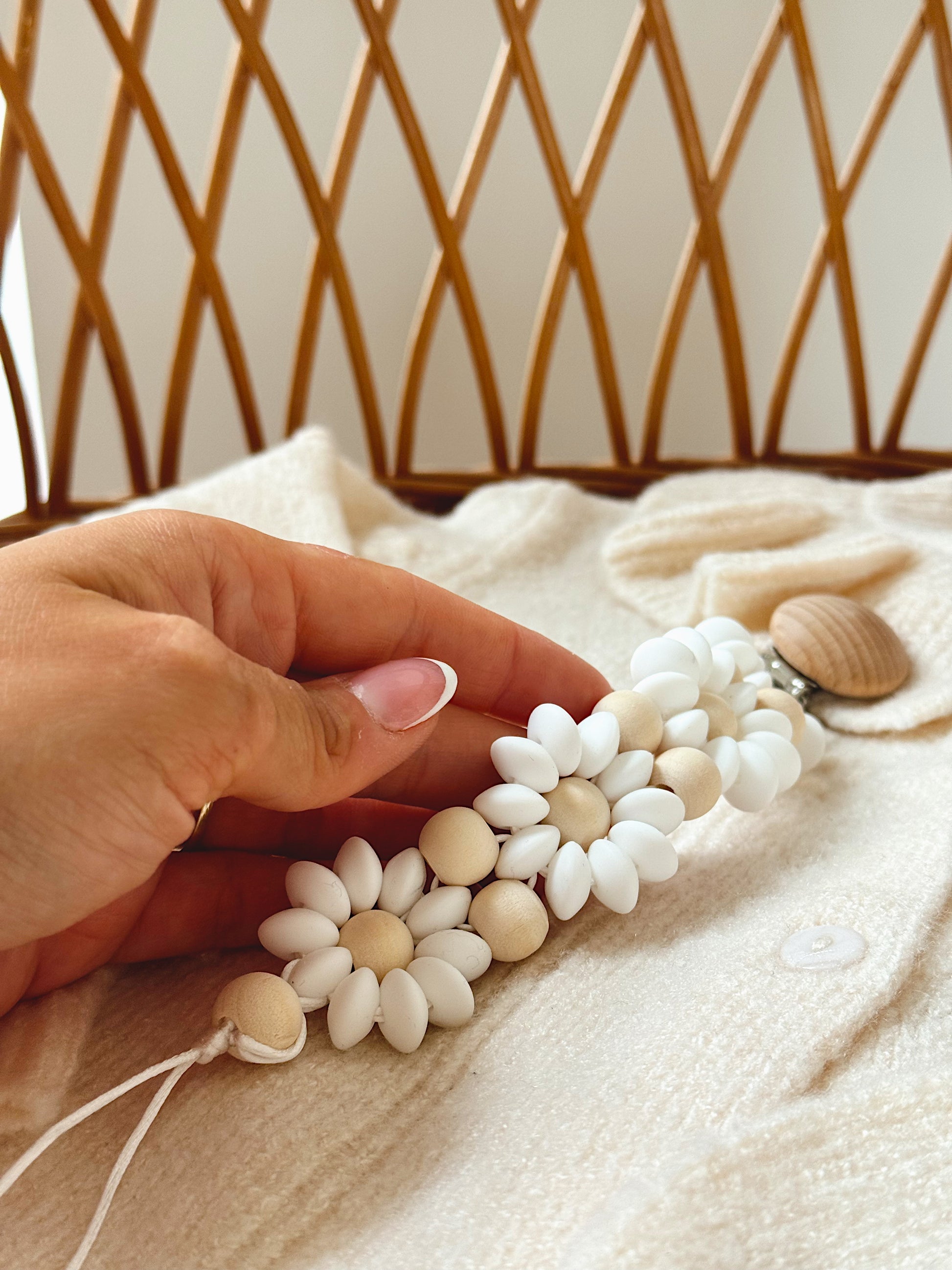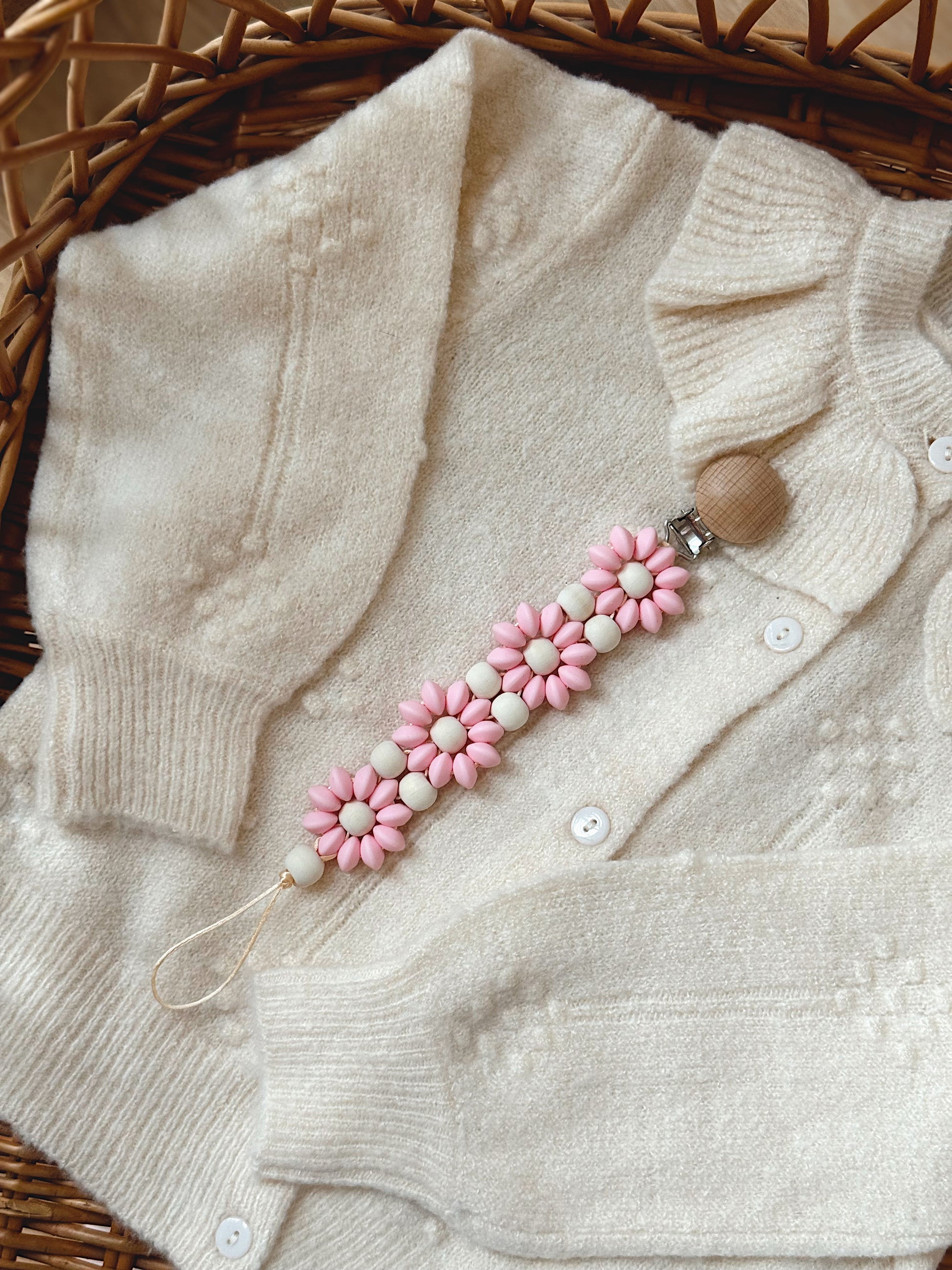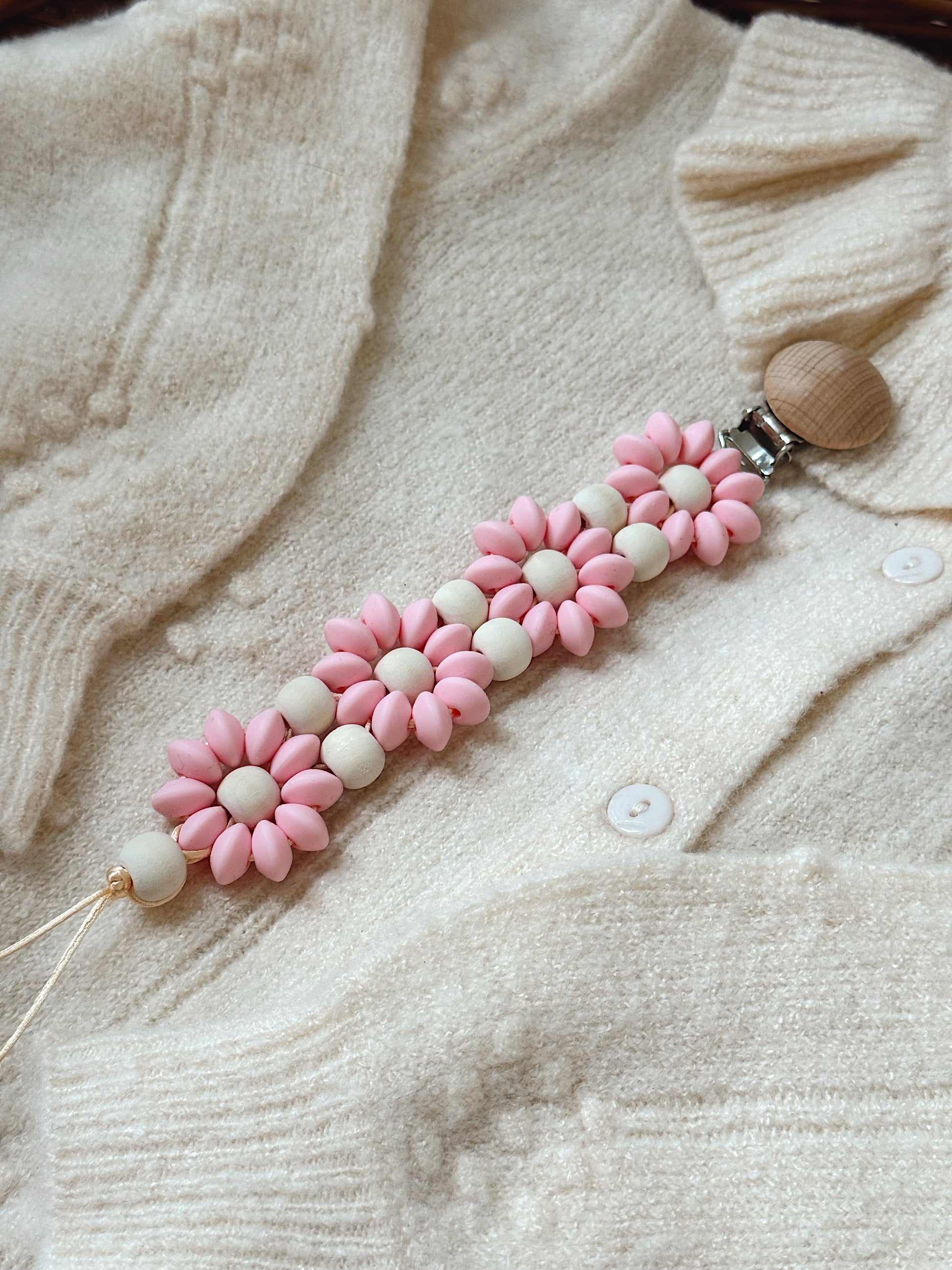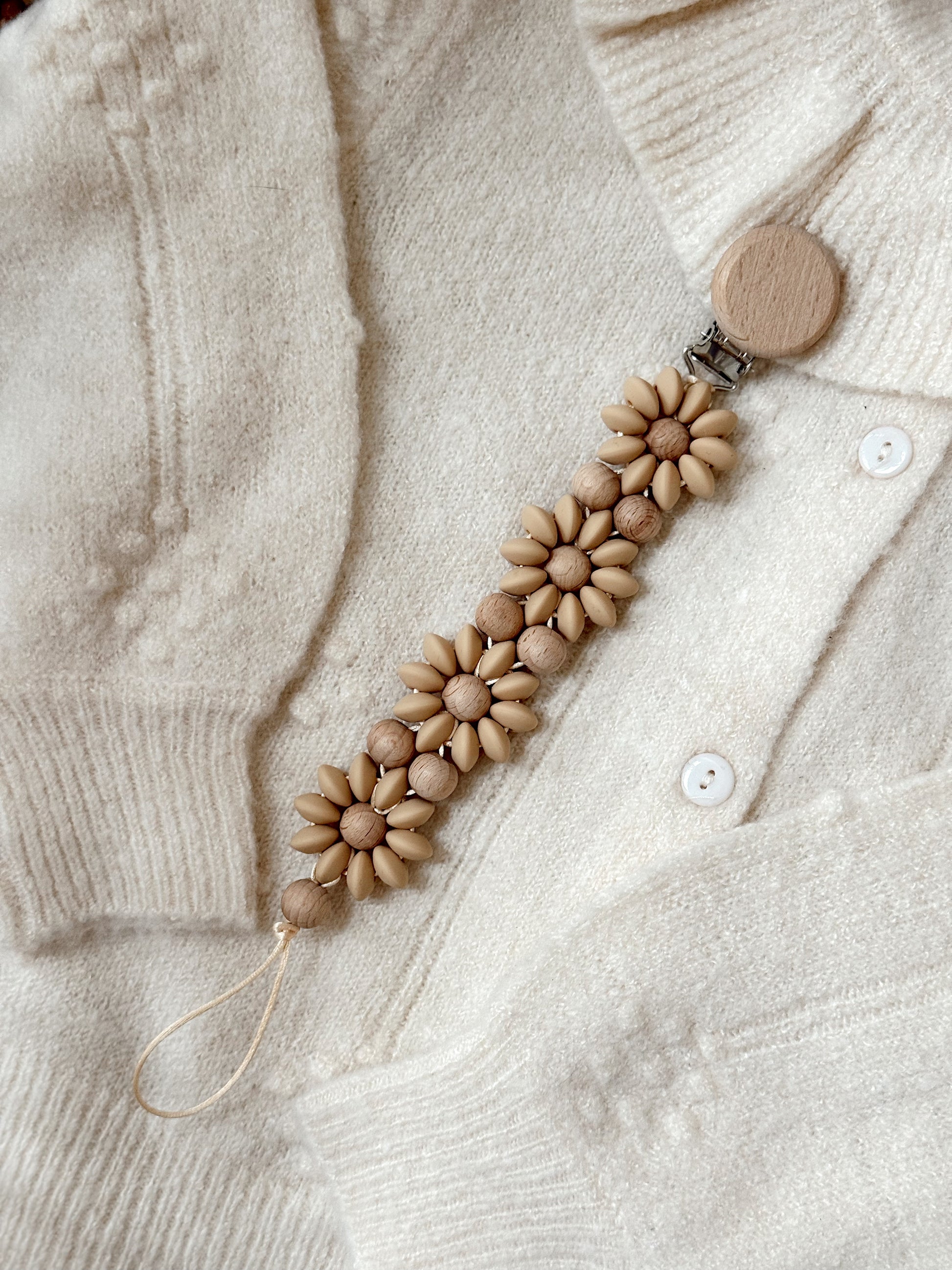 Klip na dudlík s kopretinou je ručně vyrobený přívěšek v kombinaci netoxických silikonových a dřevěných korálků. Stylový doplněk a zároveň praktický pomocník. Díky jemným barvám a přírodnímu dřevu se hodí ke každému outfitu i kočárku. Zabraňuje pádu dudlíku na zem a je ideální na procházky i doma.