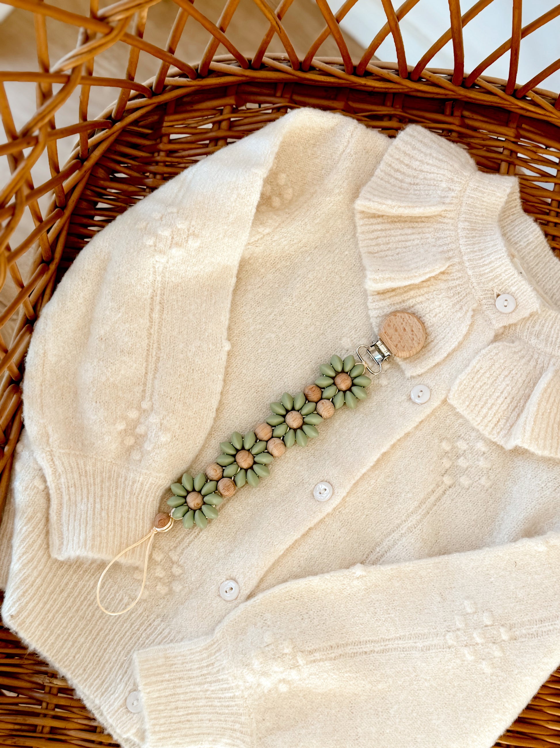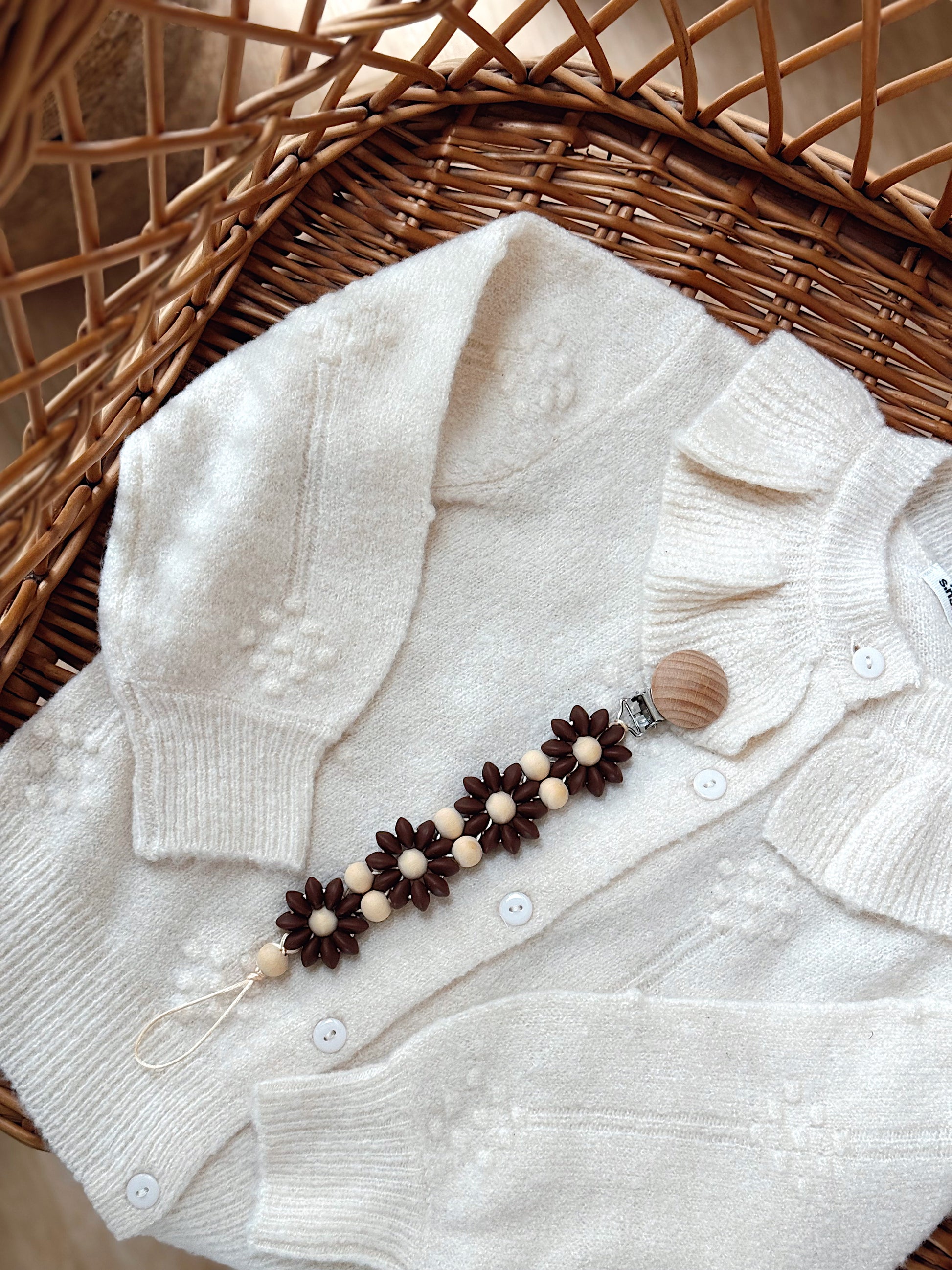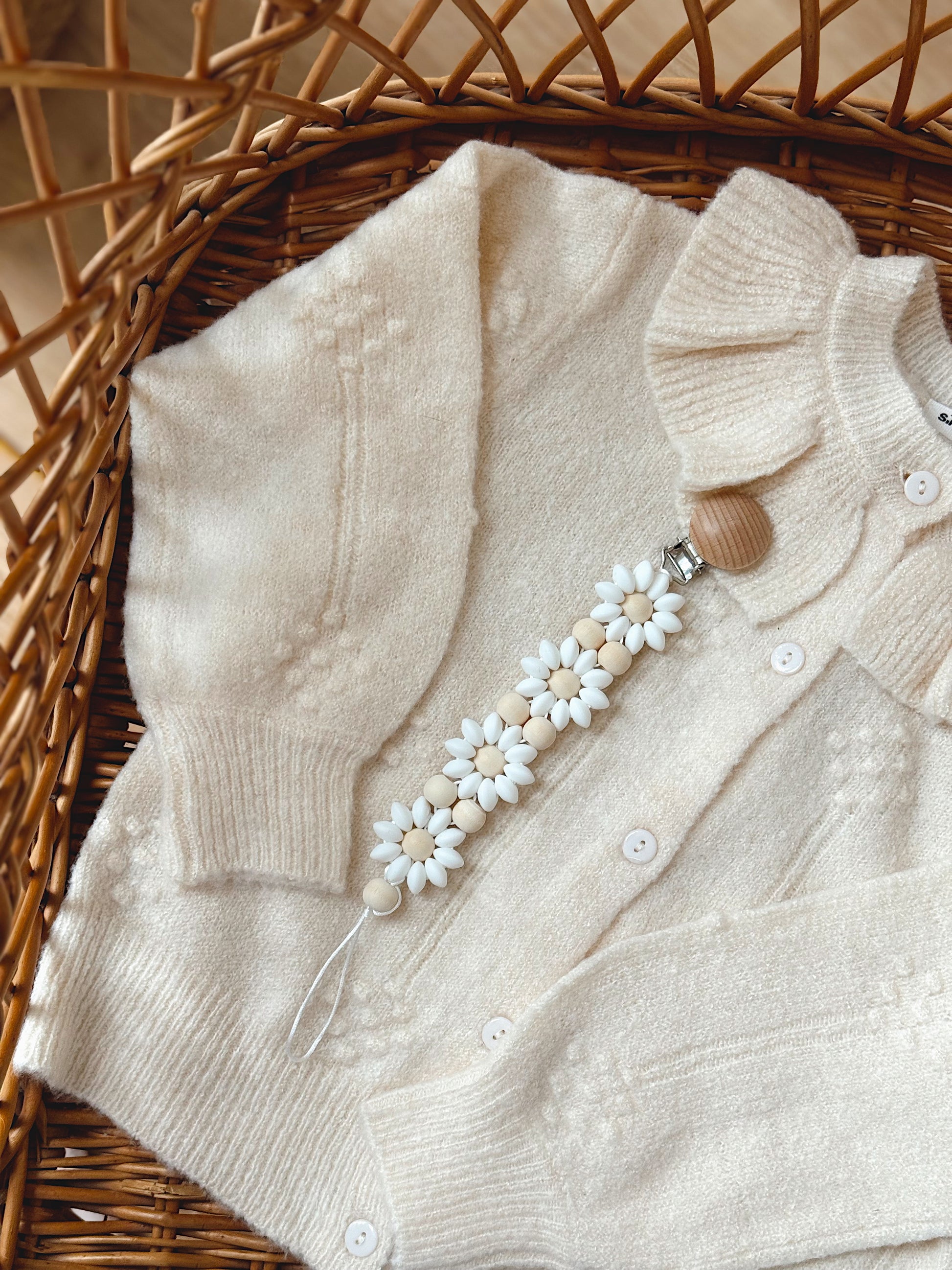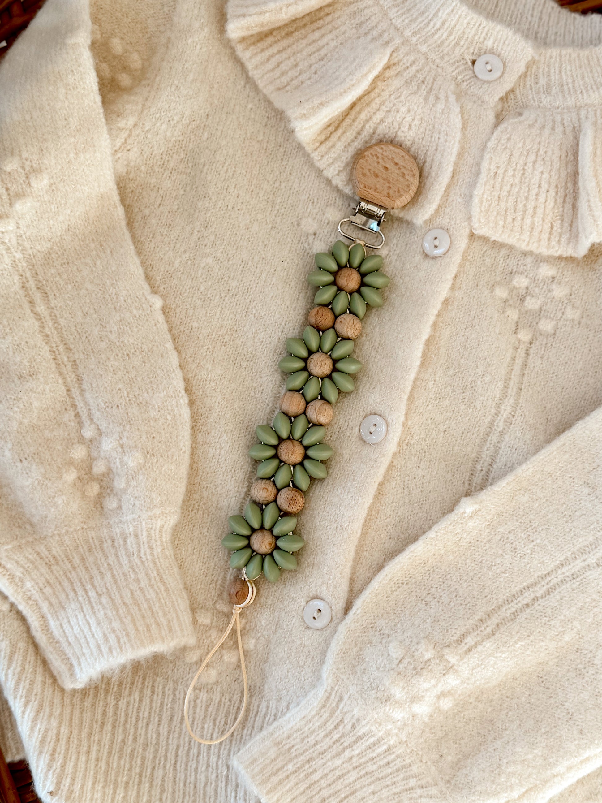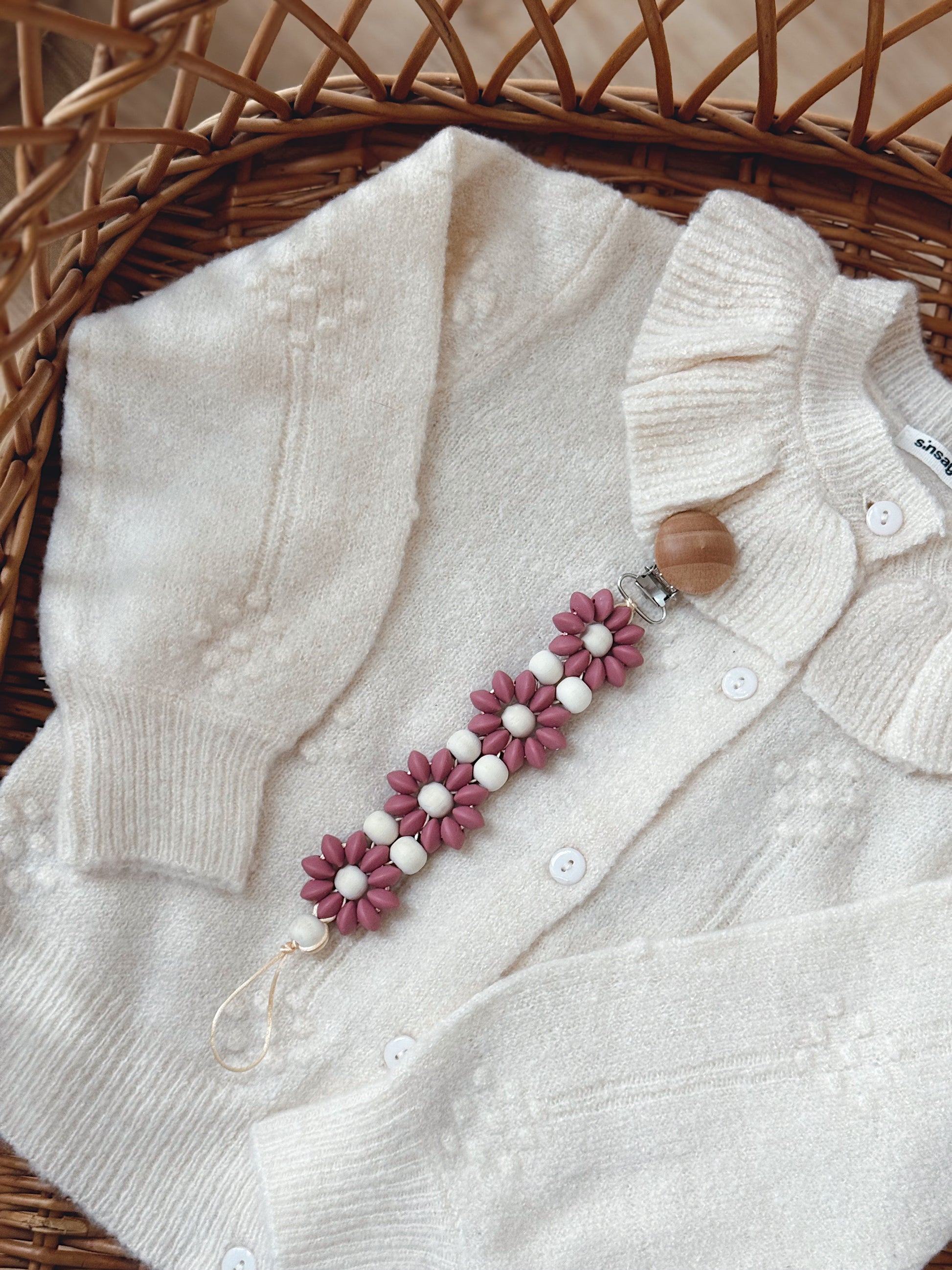 Klip na dudlík s kopretinou je ručně vyrobený přívěšek v kombinaci netoxických silikonových a dřevěných korálků. Stylový doplněk a zároveň praktický pomocník. Díky jemným barvám a přírodnímu dřevu se hodí ke každému outfitu i kočárku. Zabraňuje pádu dudlíku na zem a je ideální na procházky i doma.
