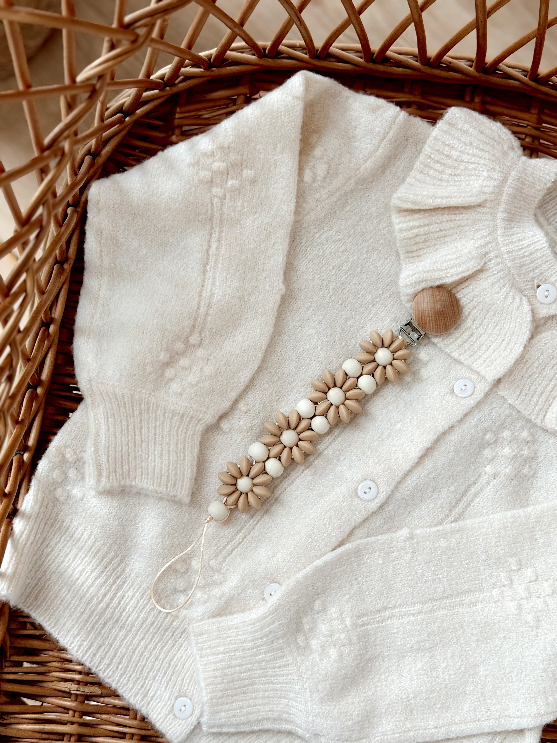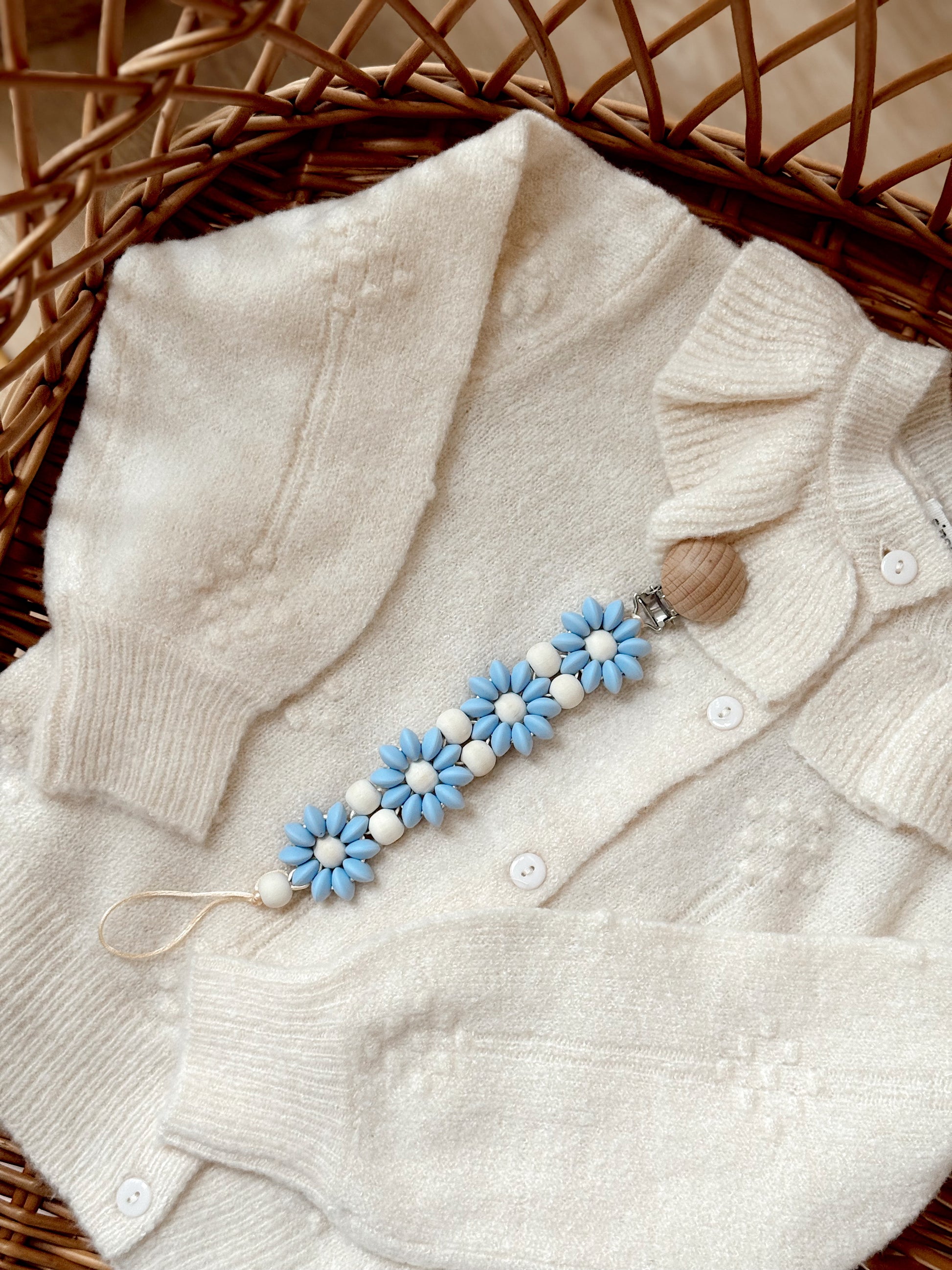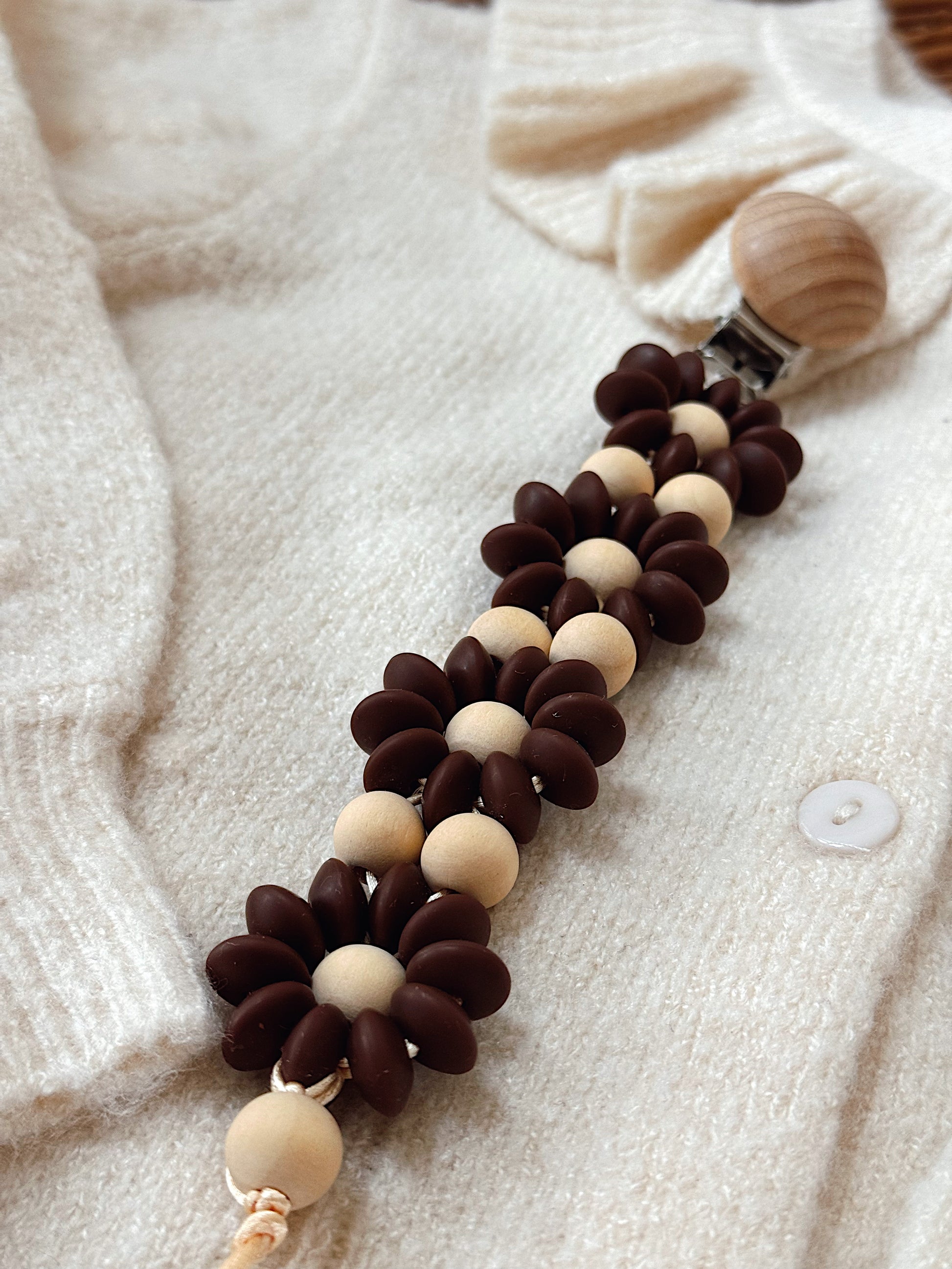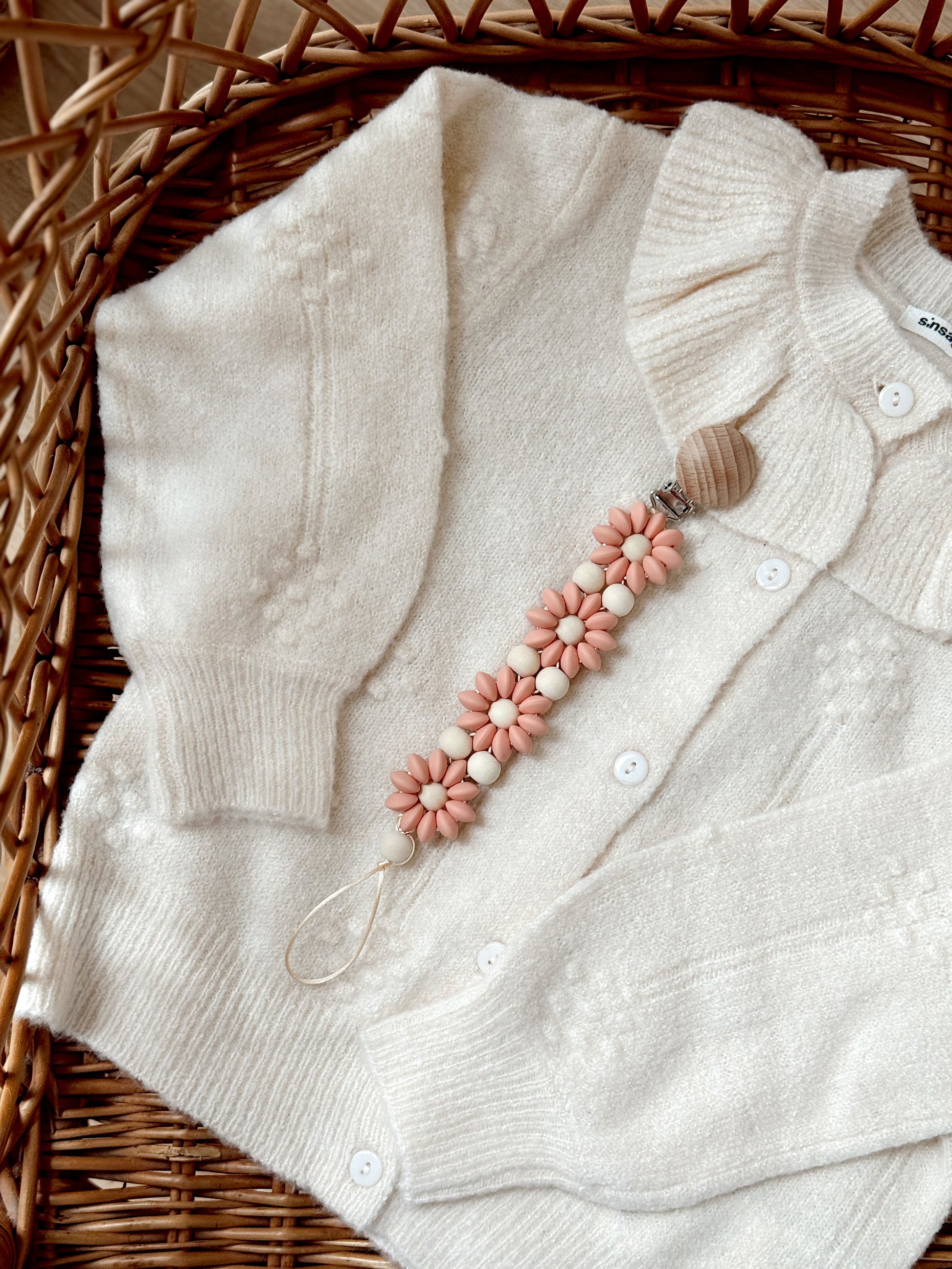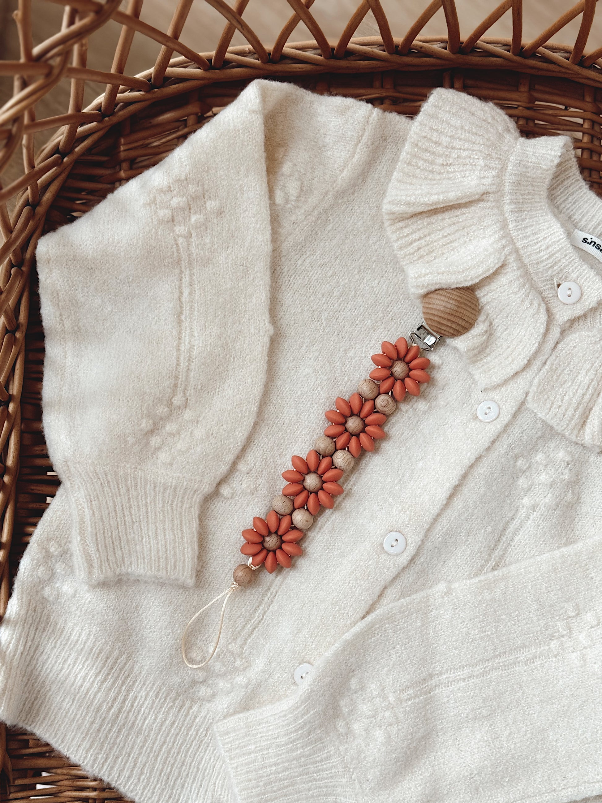 Klip na dudlík s kopretinou je ručně vyrobený přívěšek v kombinaci netoxických silikonových a dřevěných korálků. Stylový doplněk a zároveň praktický pomocník. Díky jemným barvám a přírodnímu dřevu se hodí ke každému outfitu i kočárku. Zabraňuje pádu dudlíku na zem a je ideální na procházky i doma.
