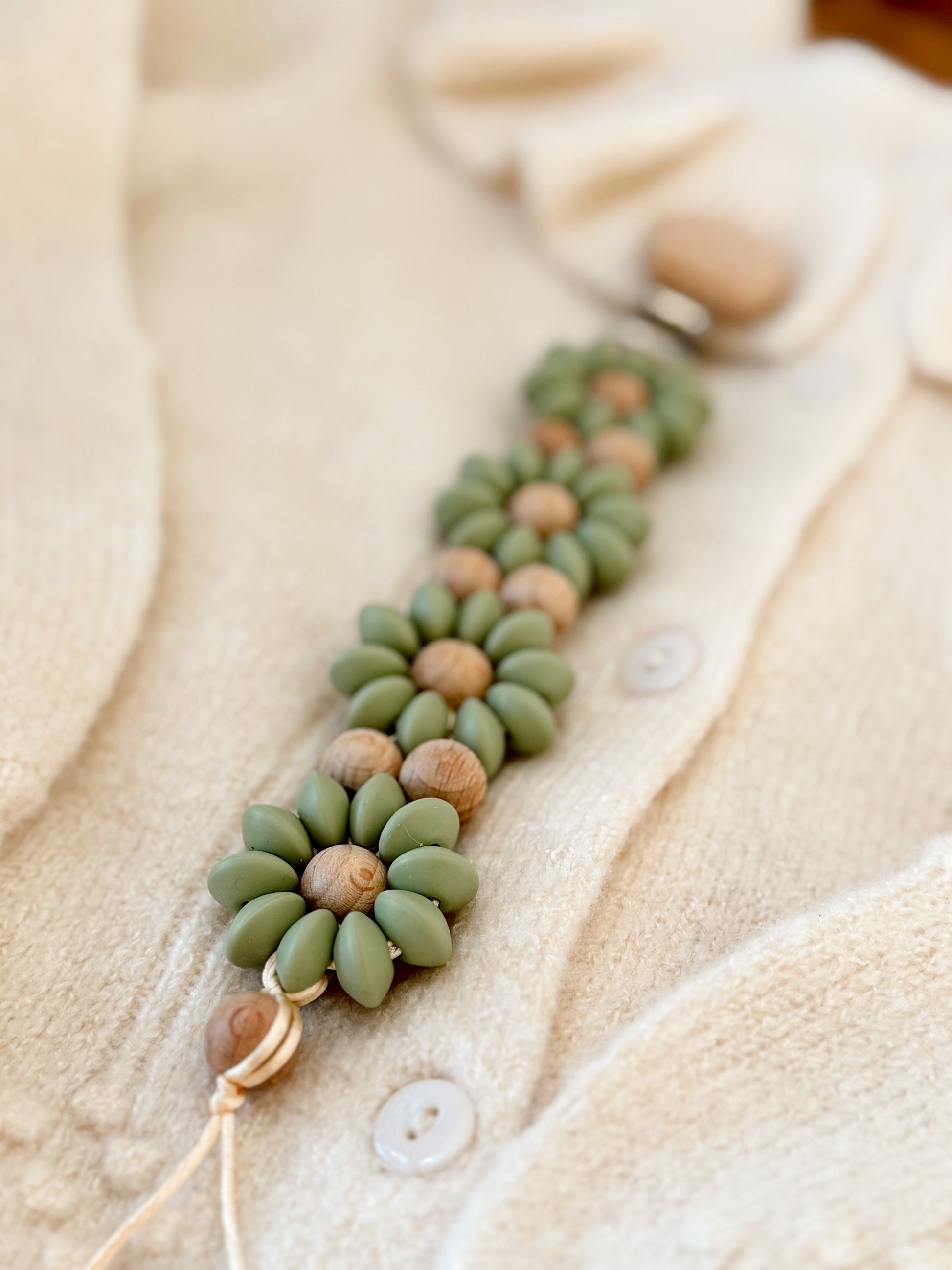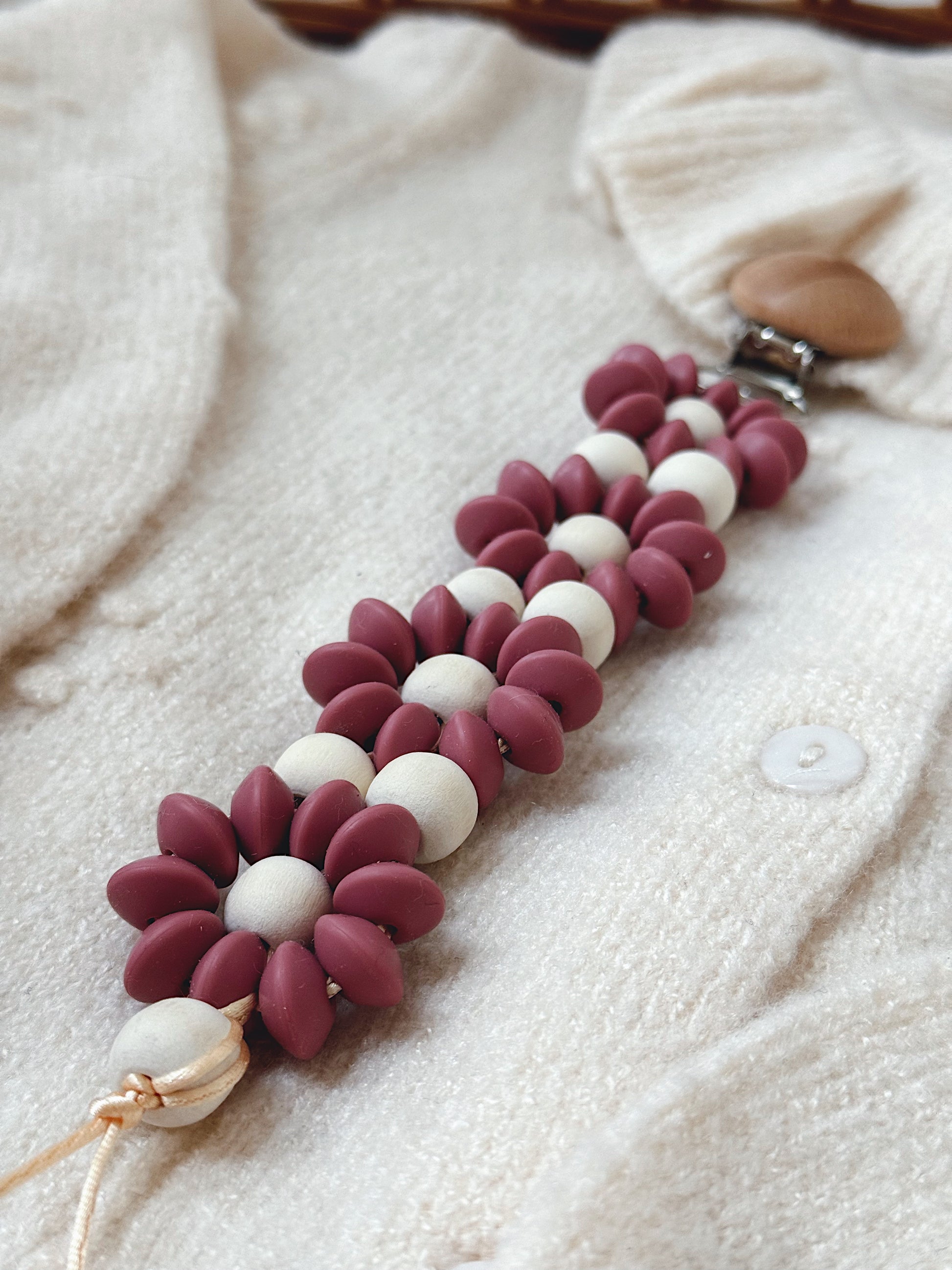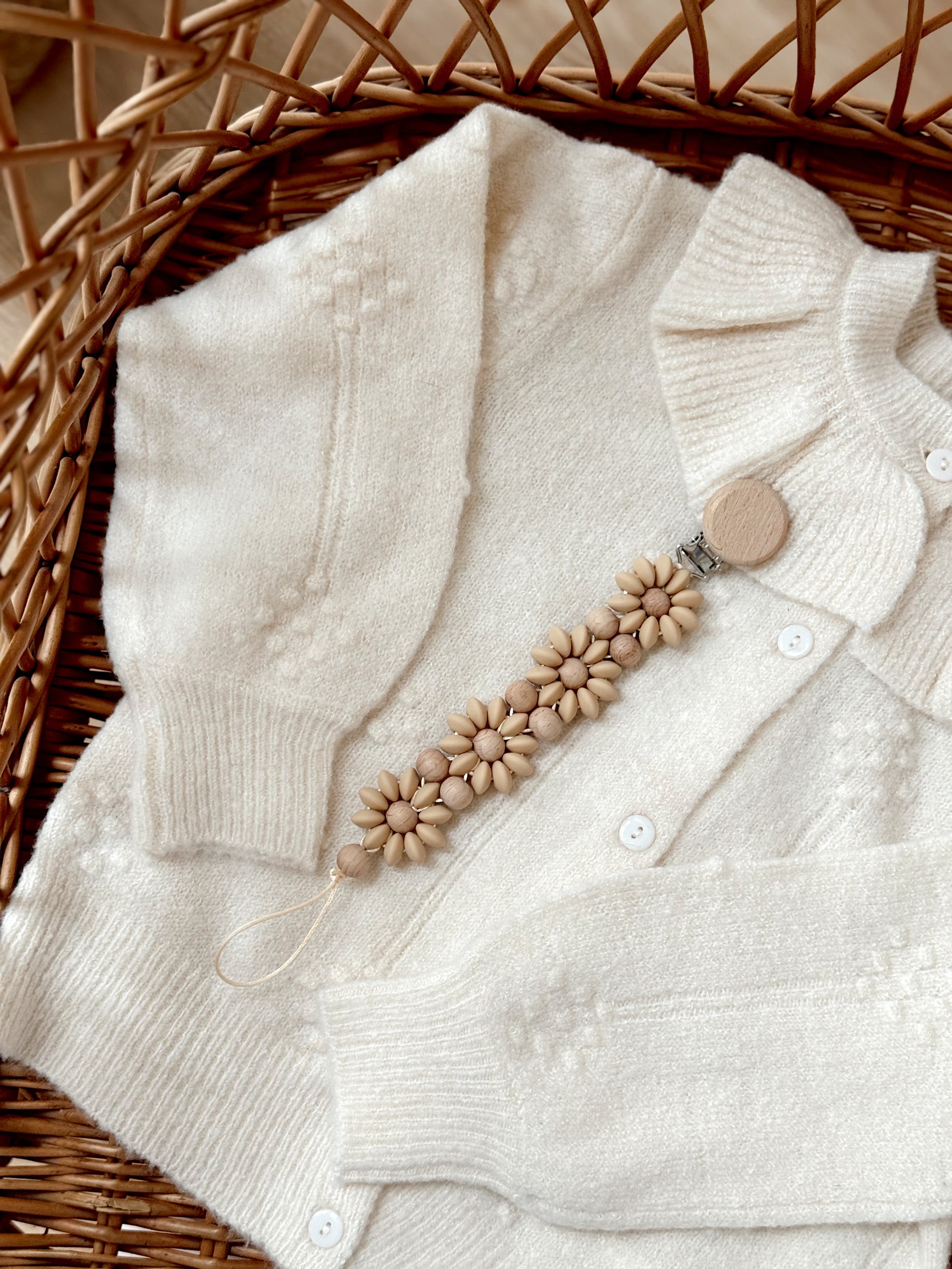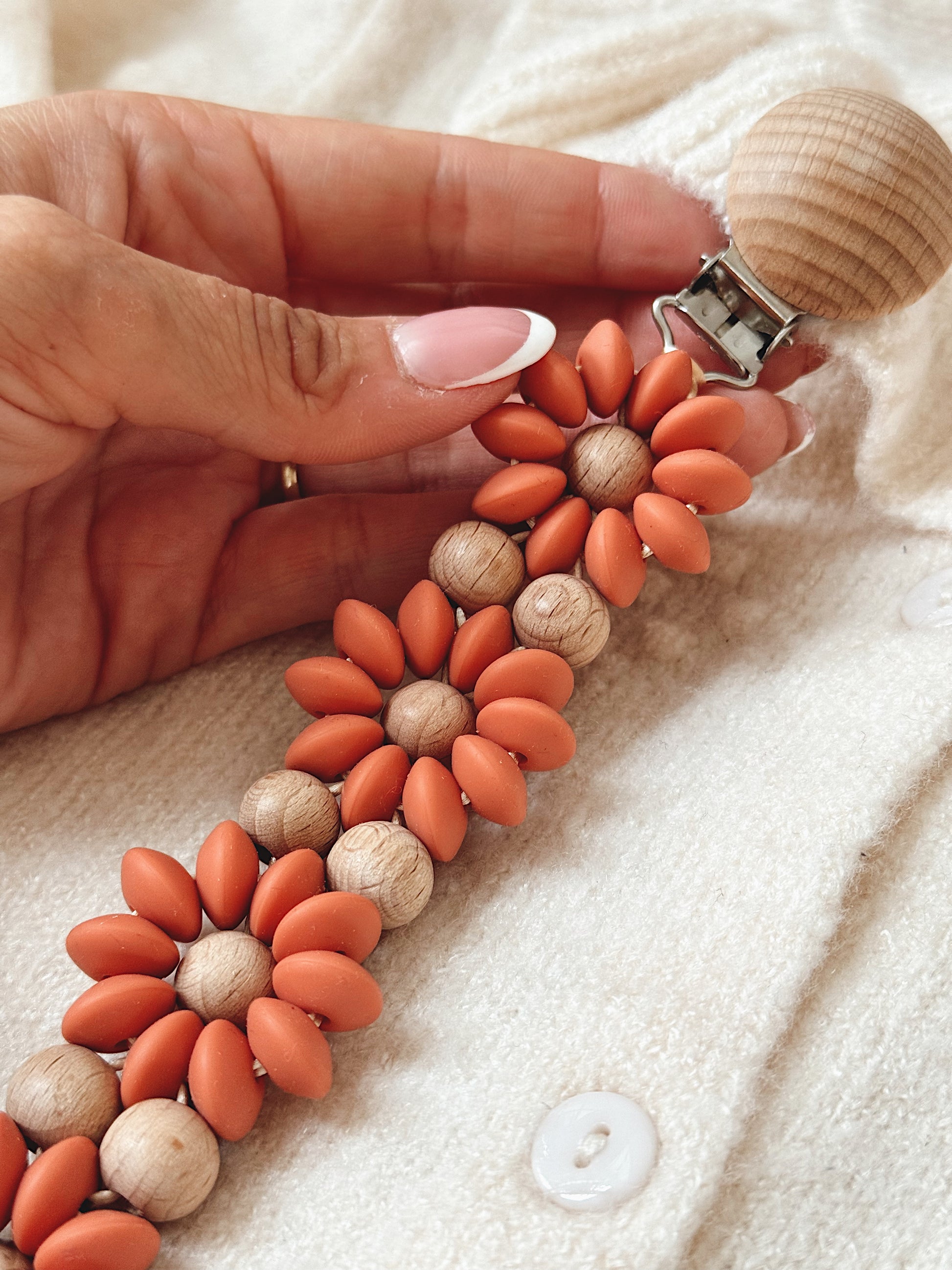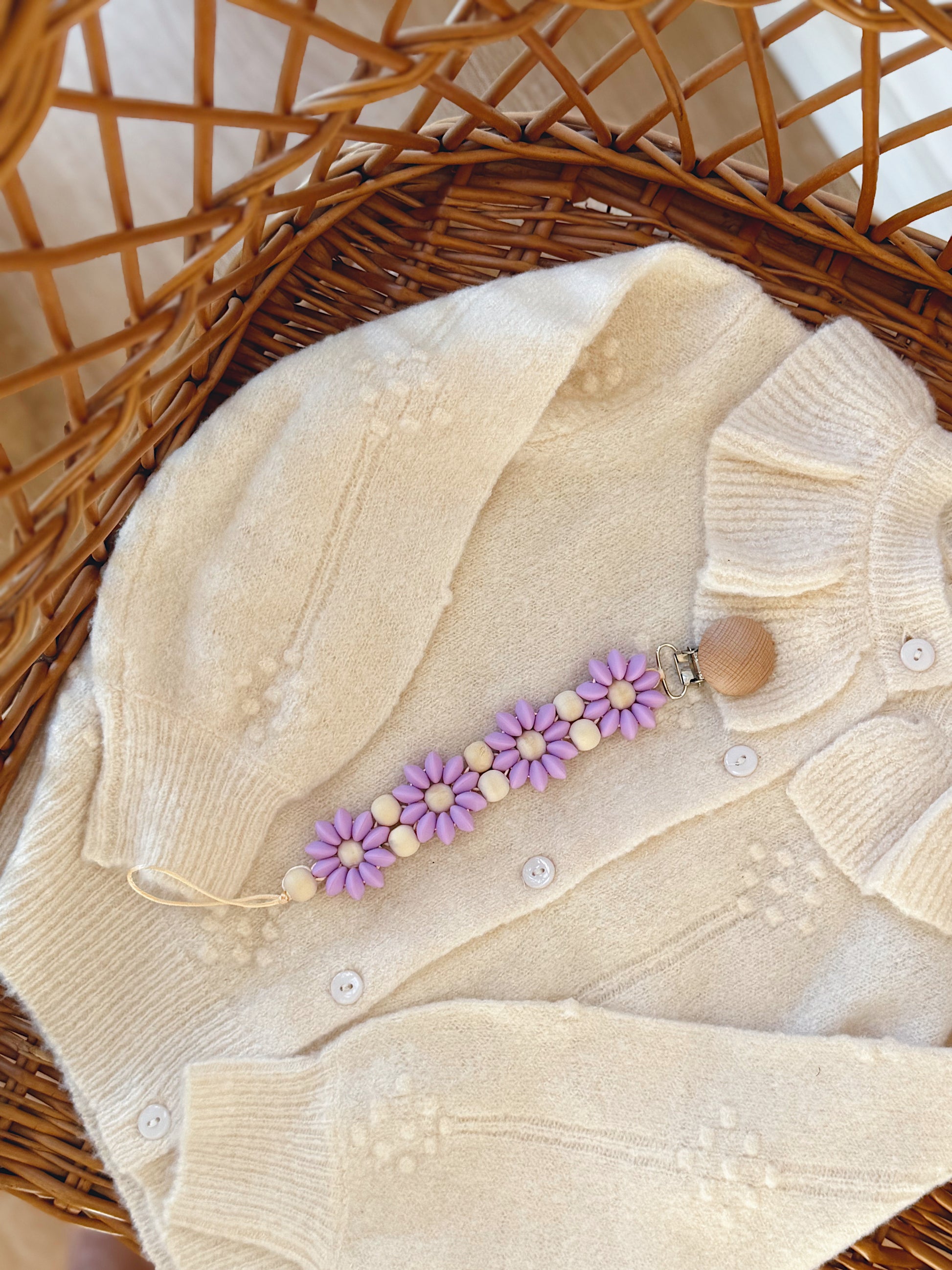 Klip na dudlík s kopretinou je ručně vyrobený přívěšek v kombinaci netoxických silikonových a dřevěných korálků. Stylový doplněk a zároveň praktický pomocník. Díky jemným barvám a přírodnímu dřevu se hodí ke každému outfitu i kočárku. Zabraňuje pádu dudlíku na zem a je ideální na procházky i doma.