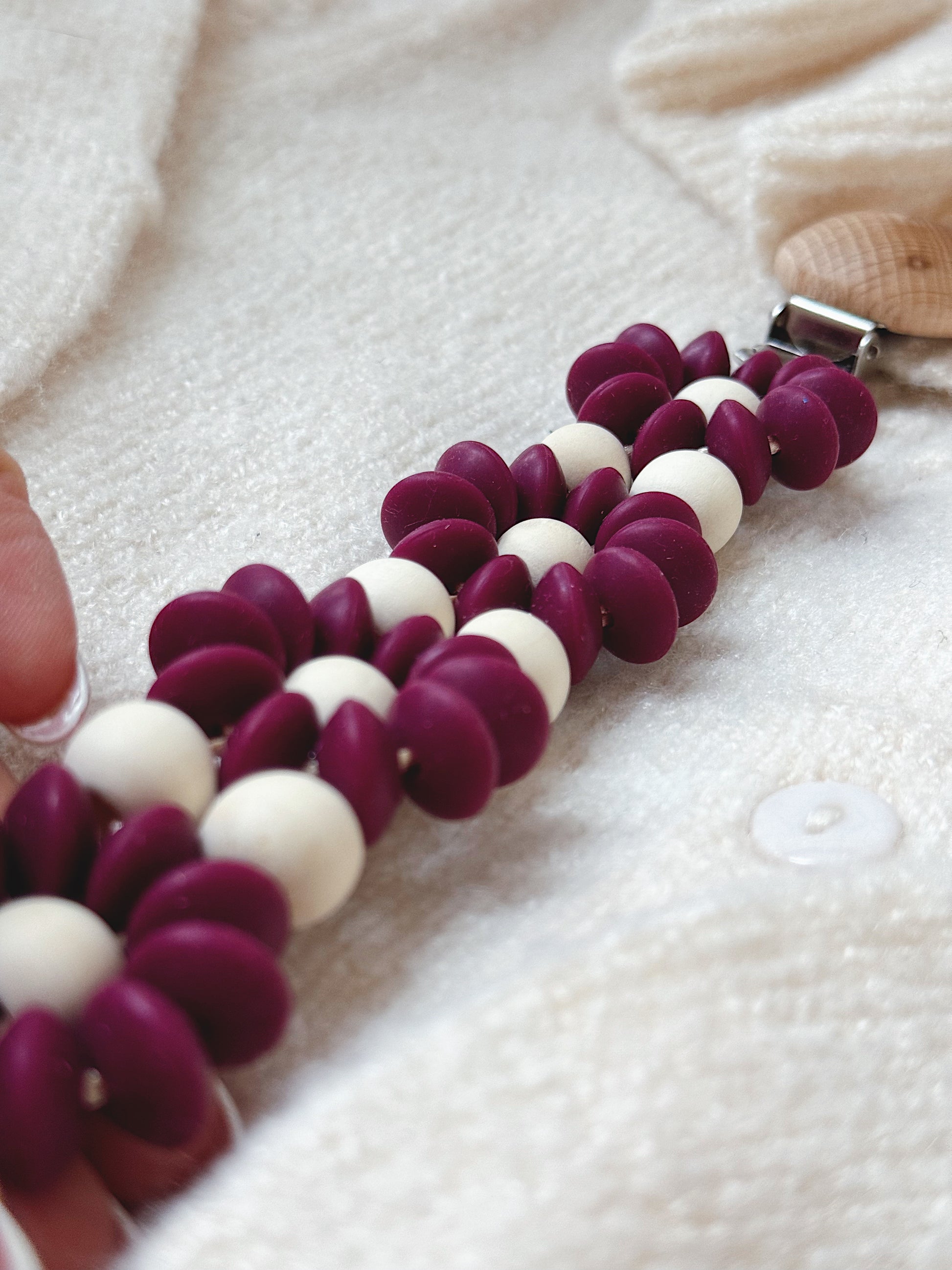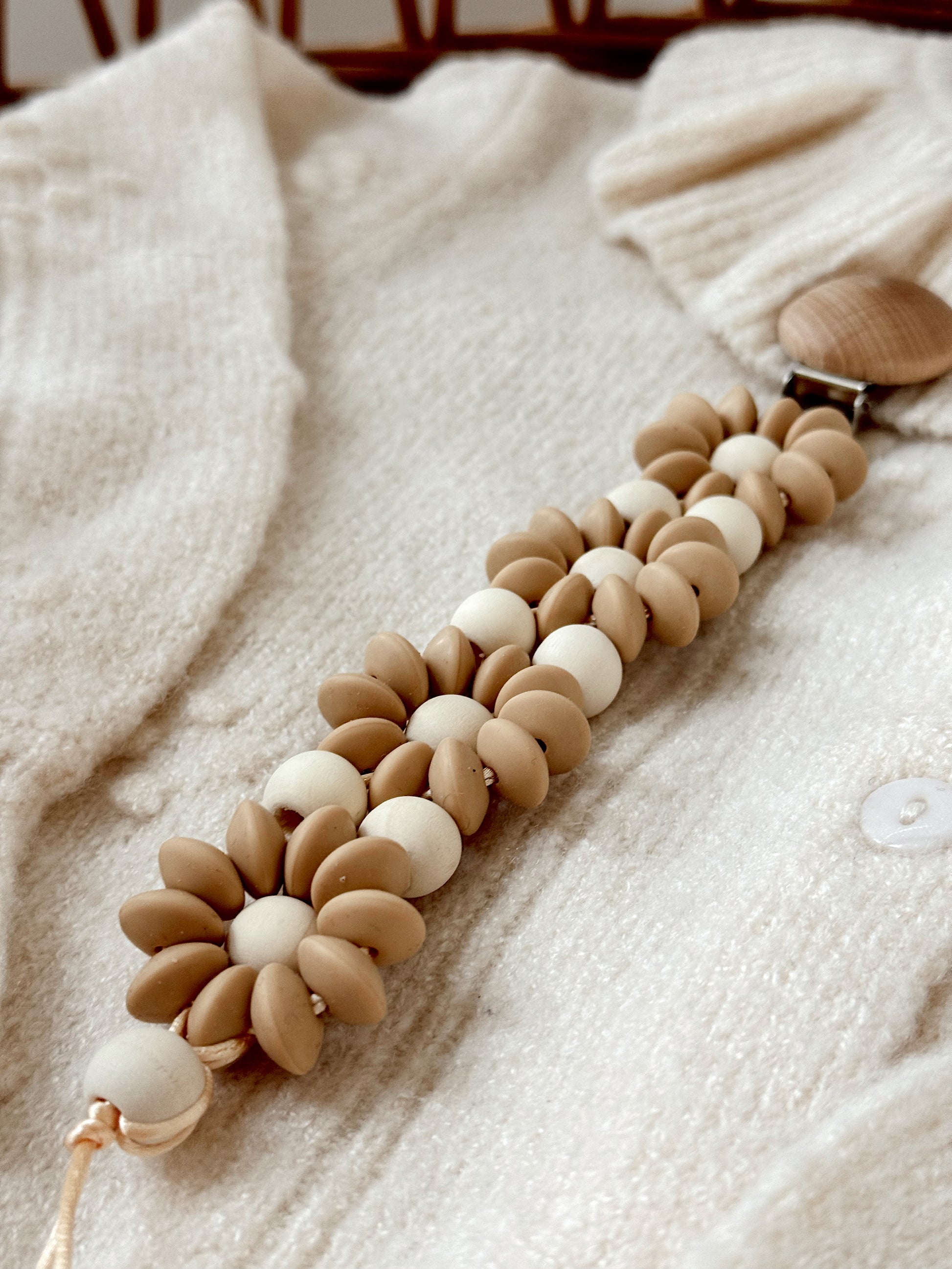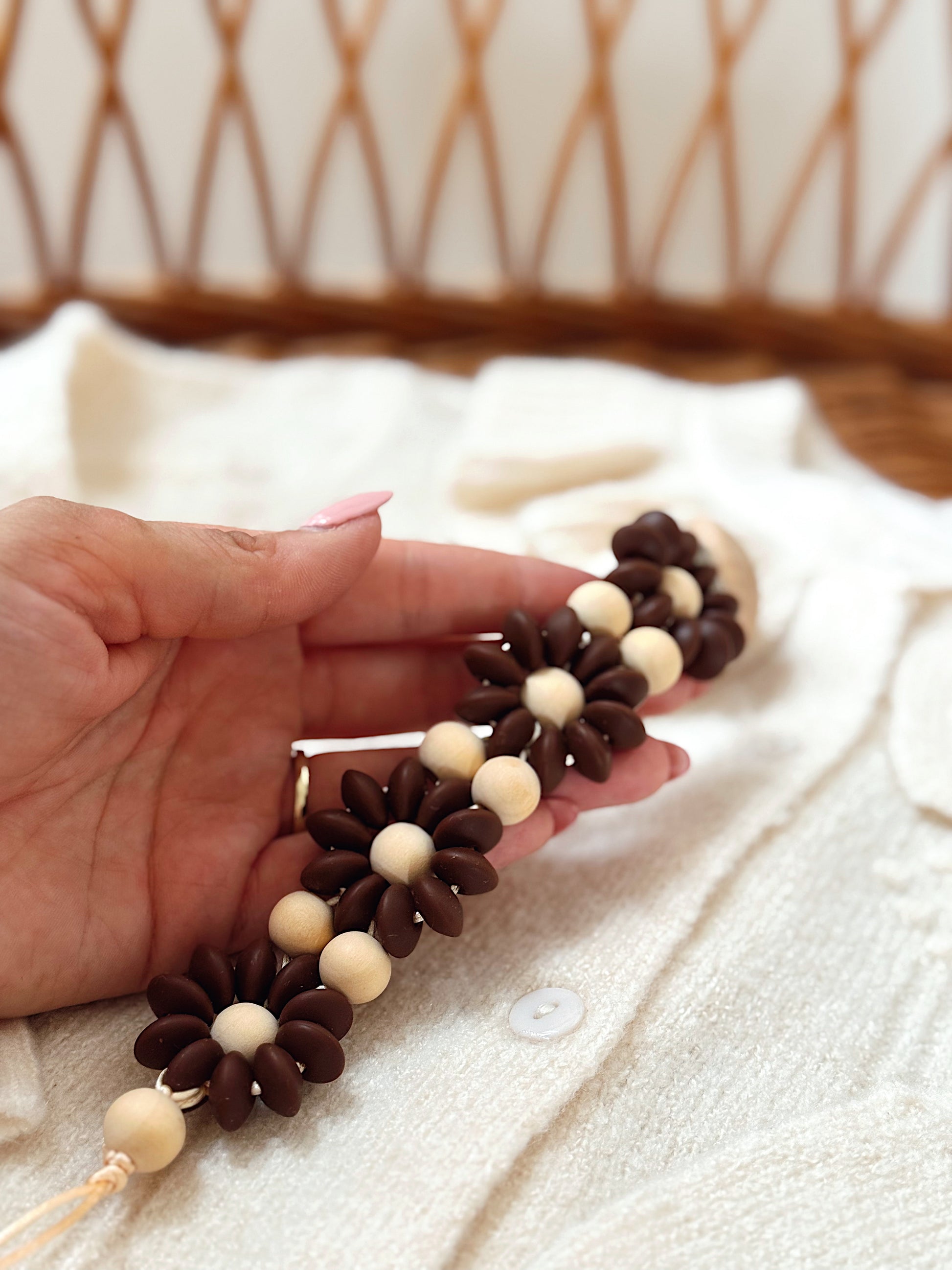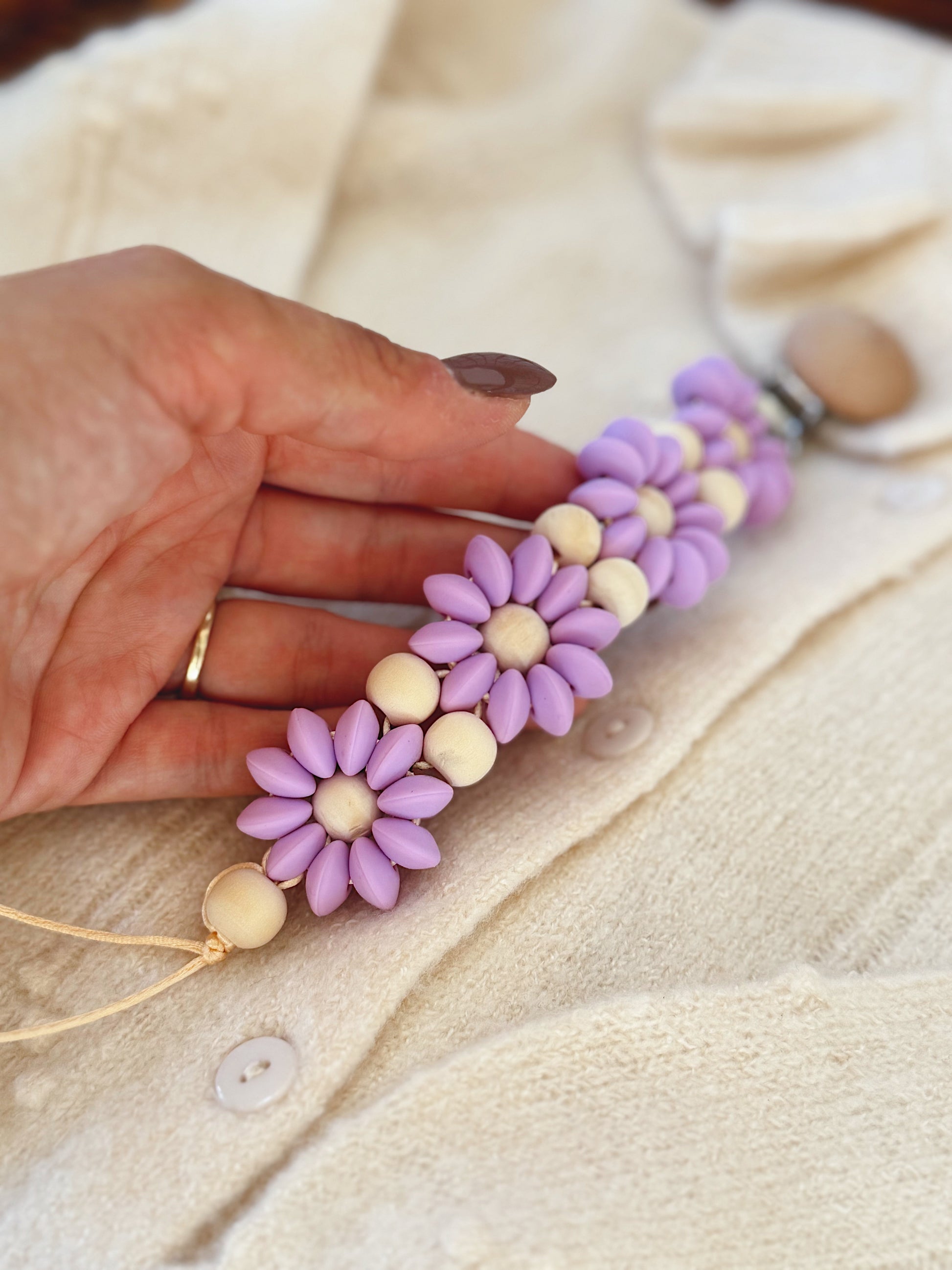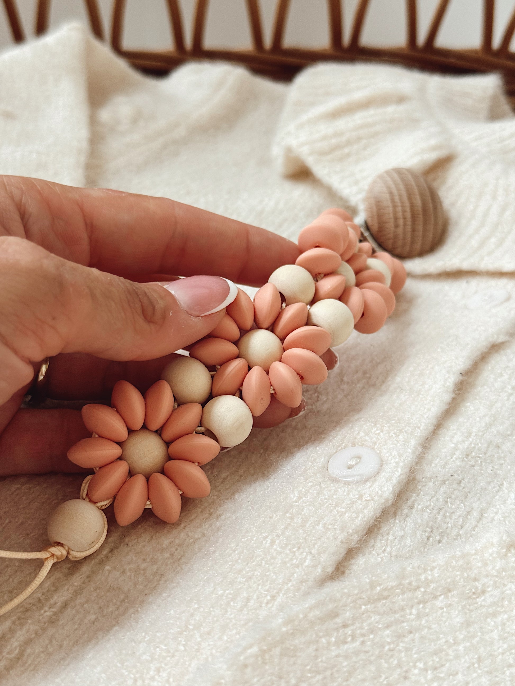 Klip na dudlík s kopretinou je ručně vyrobený přívěšek v kombinaci netoxických silikonových a dřevěných korálků. Stylový doplněk a zároveň praktický pomocník. Díky jemným barvám a přírodnímu dřevu se hodí ke každému outfitu i kočárku. Zabraňuje pádu dudlíku na zem a je ideální na procházky i doma.
