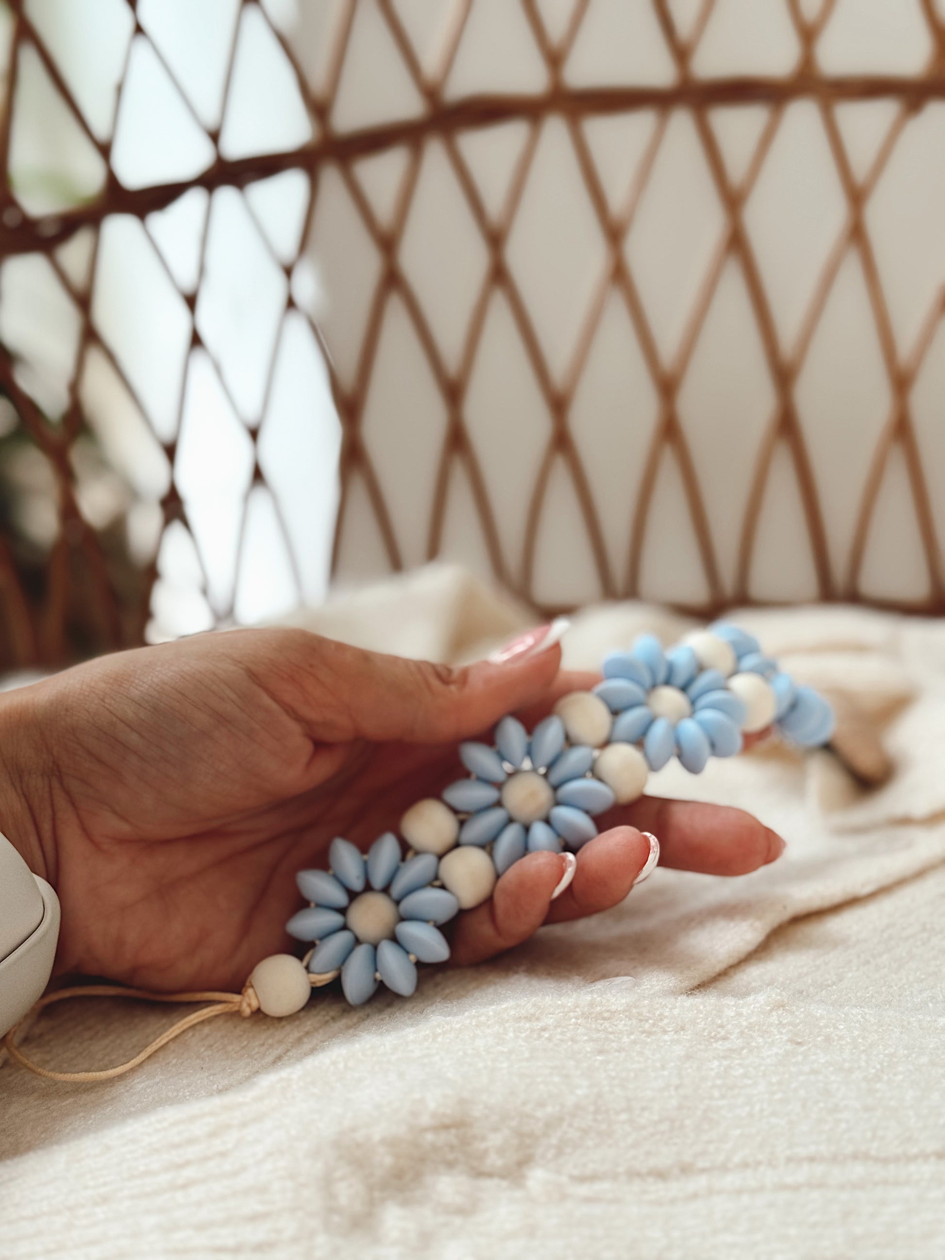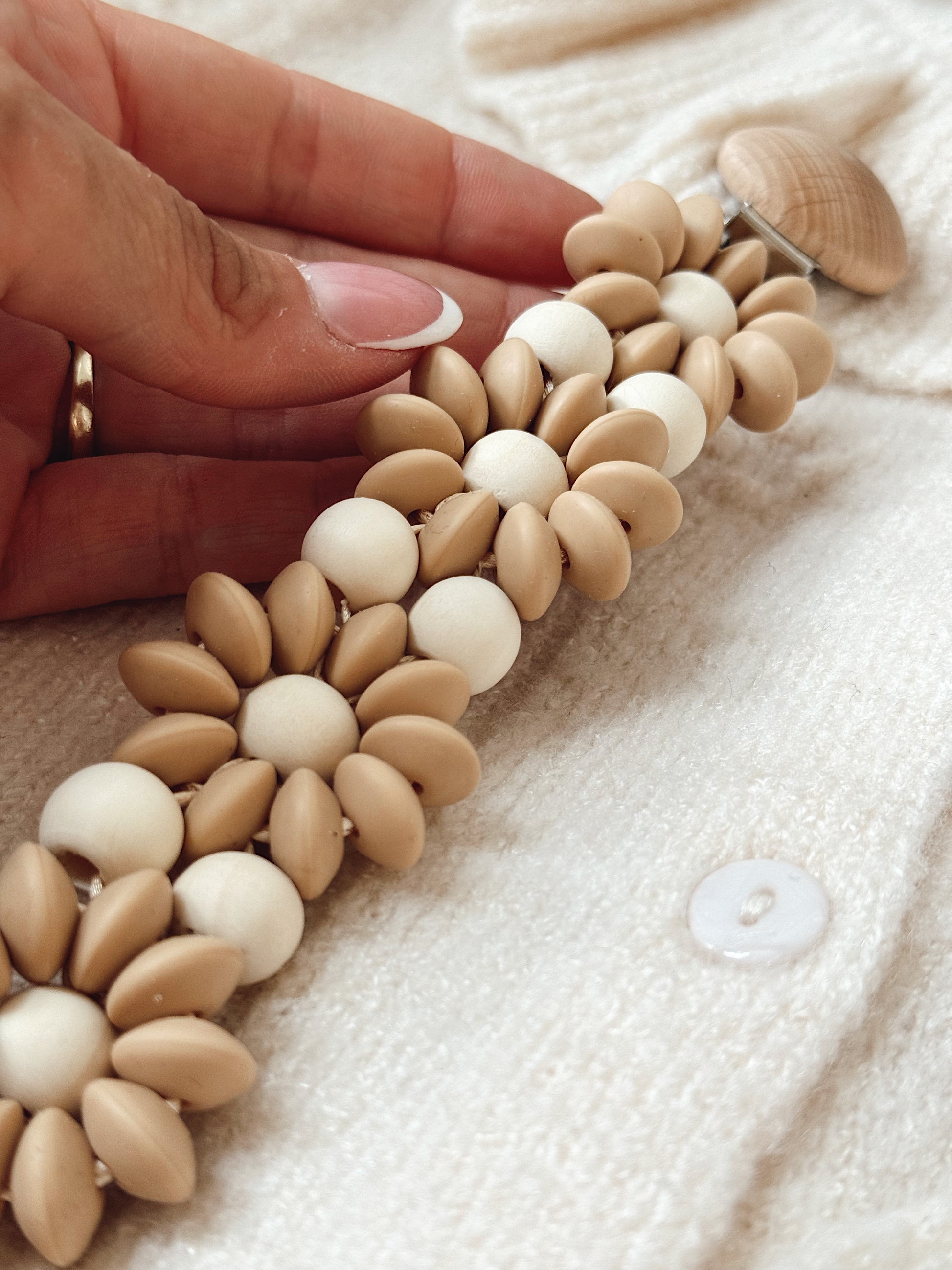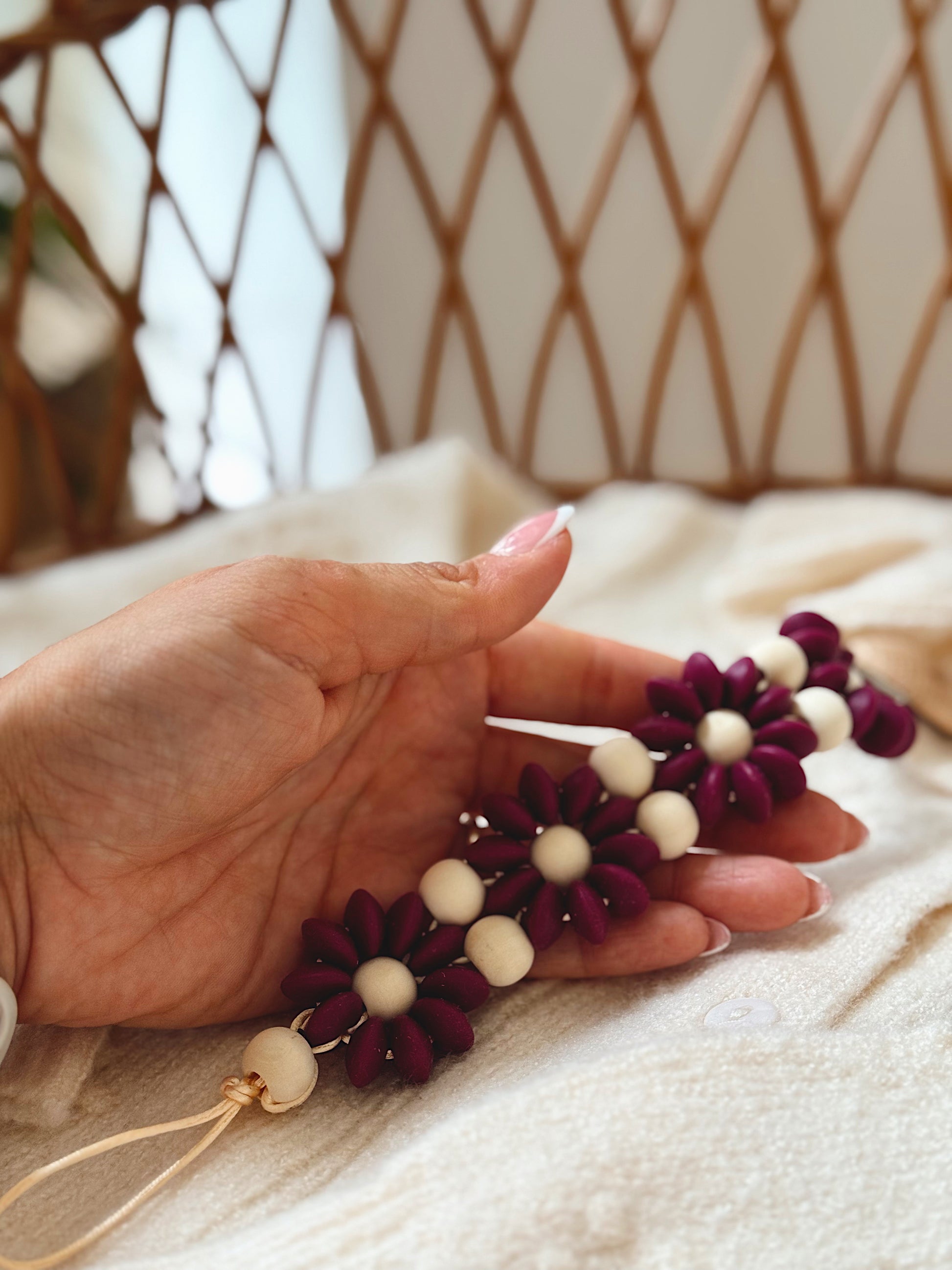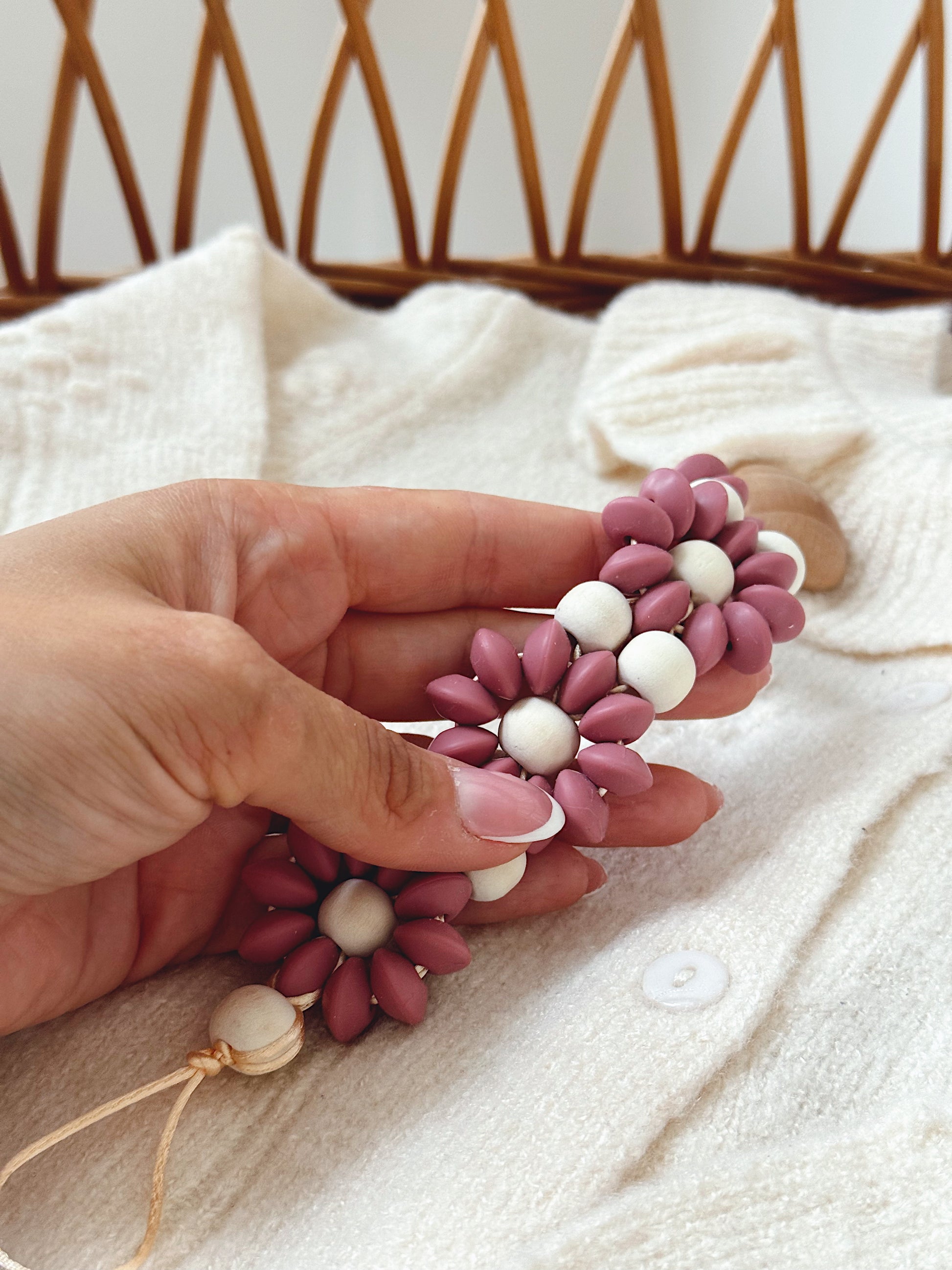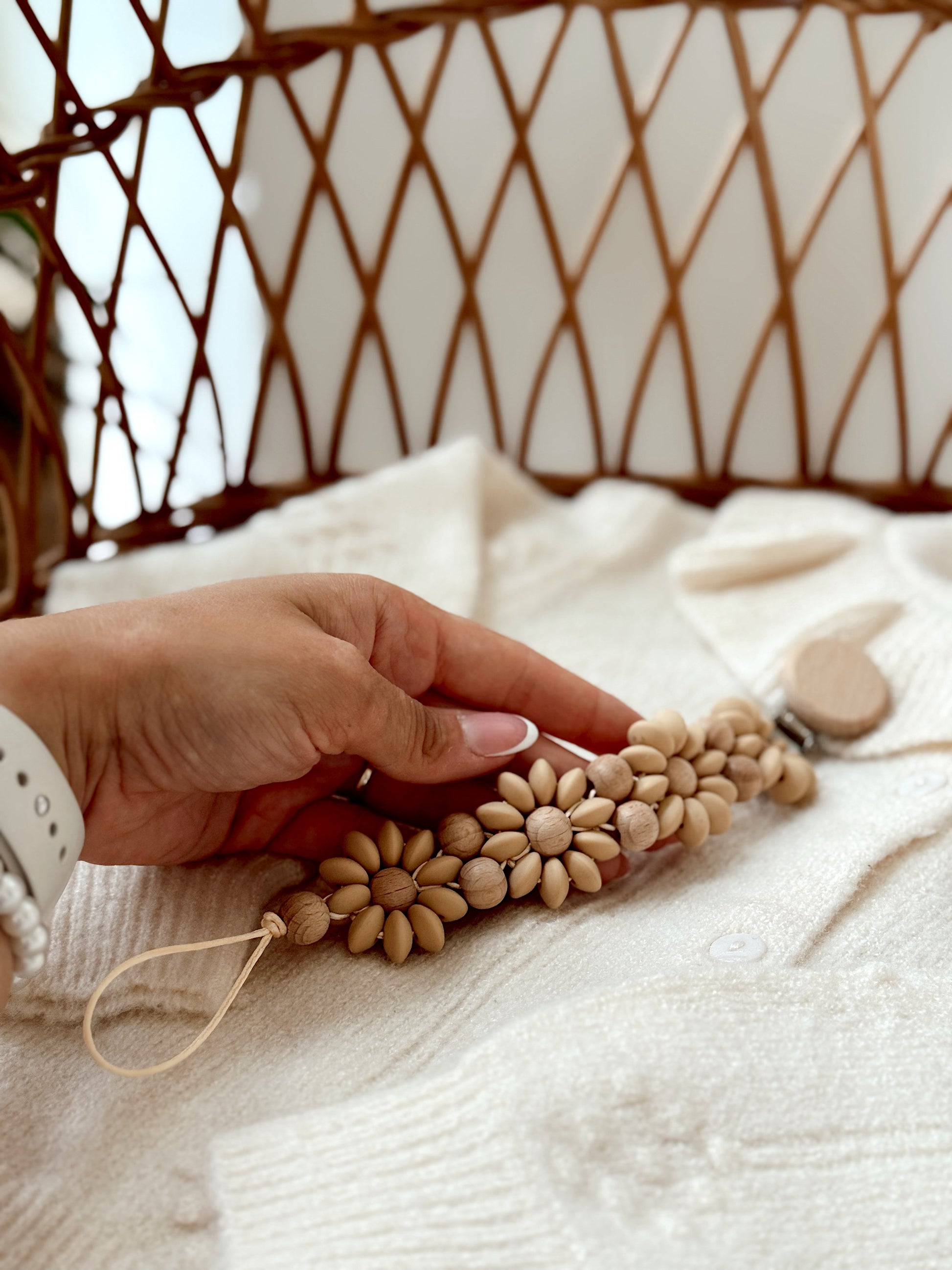 Klip na dudlík s kopretinou je ručně vyrobený přívěšek v kombinaci netoxických silikonových a dřevěných korálků. Stylový doplněk a zároveň praktický pomocník. Díky jemným barvám a přírodnímu dřevu se hodí ke každému outfitu i kočárku. Zabraňuje pádu dudlíku na zem a je ideální na procházky i doma.