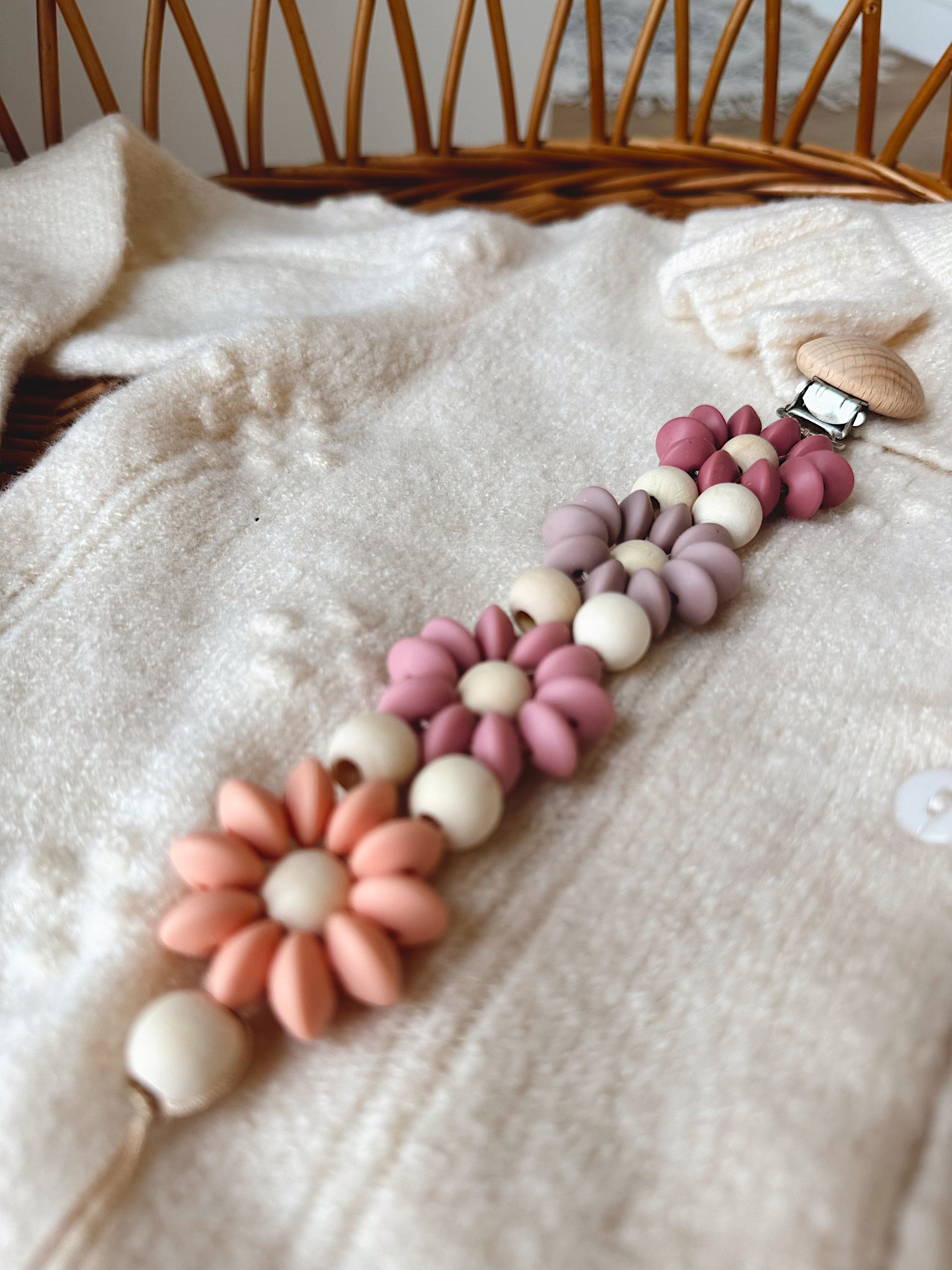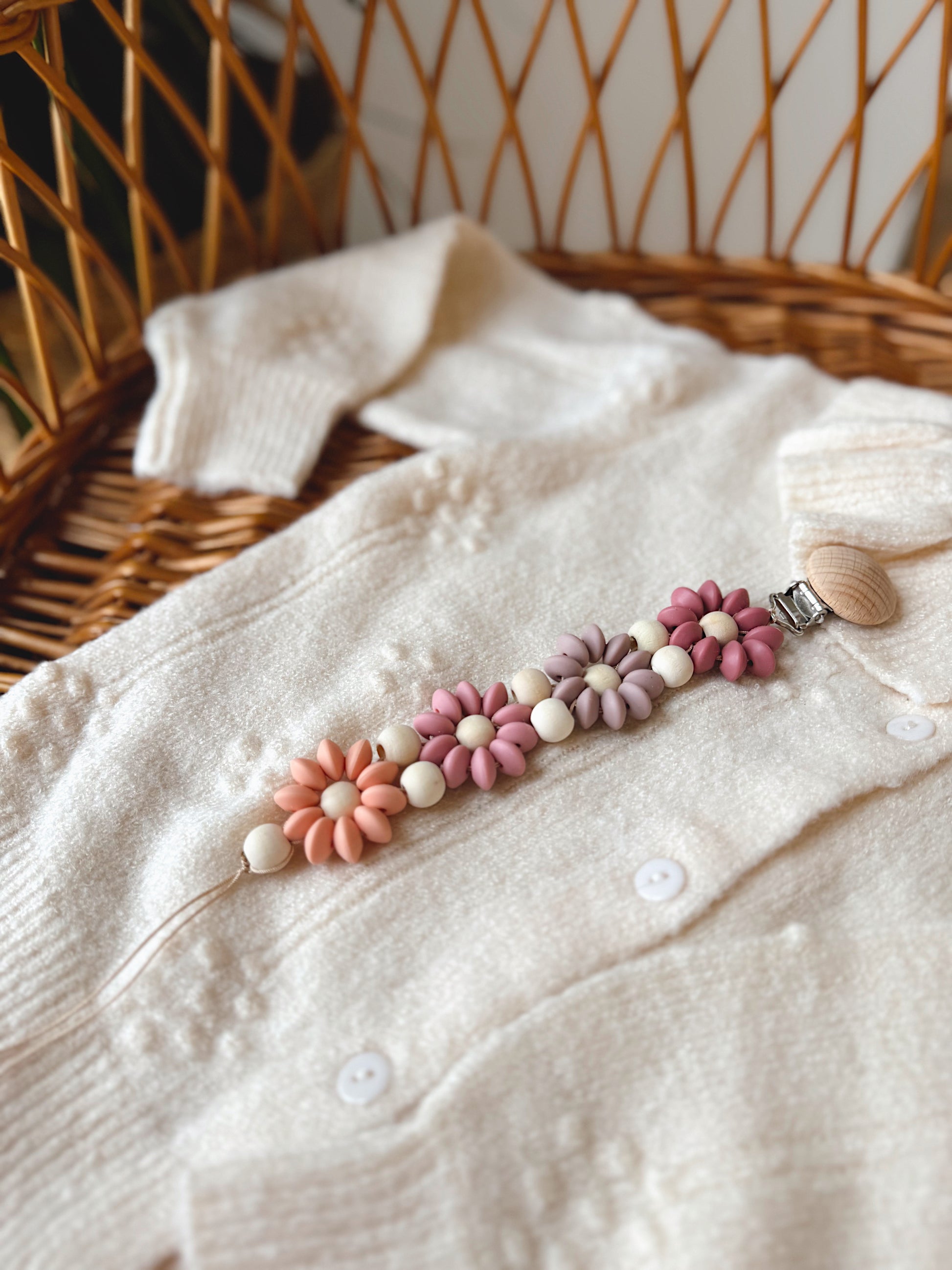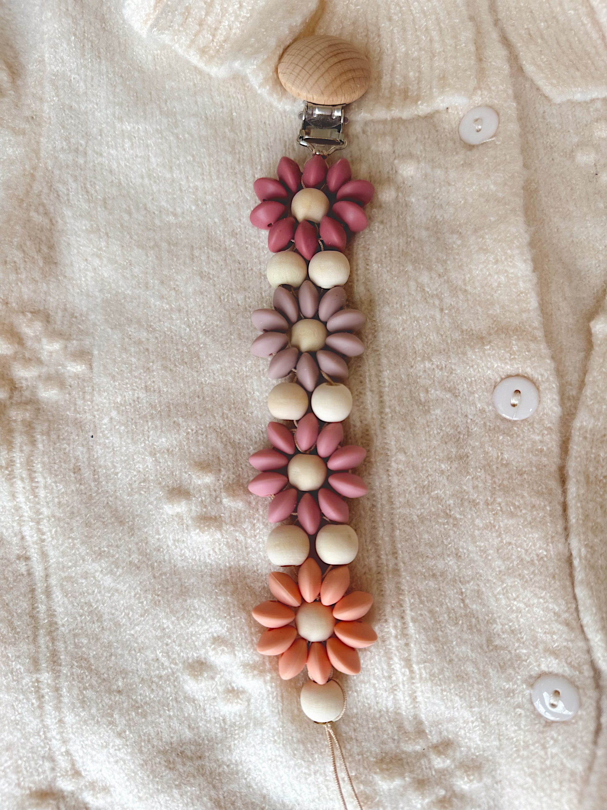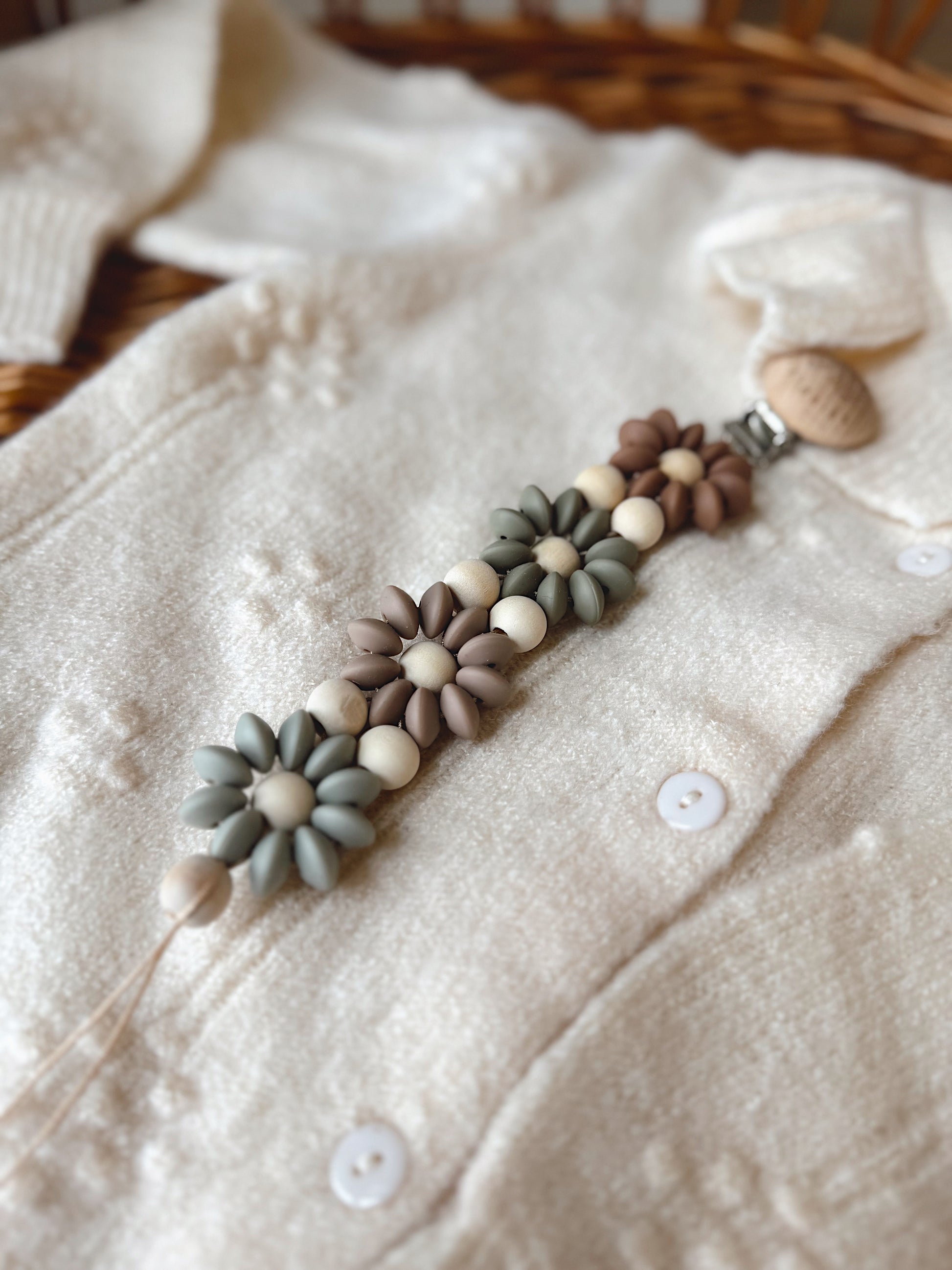 Klip na dudlík s kopretinou je ručně vyrobený přívěšek v kombinaci netoxických silikonových a dřevěných korálků. Stylový doplněk a zároveň praktický pomocník. Díky jemným barvám a přírodnímu dřevu se hodí ke každému outfitu i kočárku. Zabraňuje pádu dudlíku na zem a je ideální na procházky i doma.
