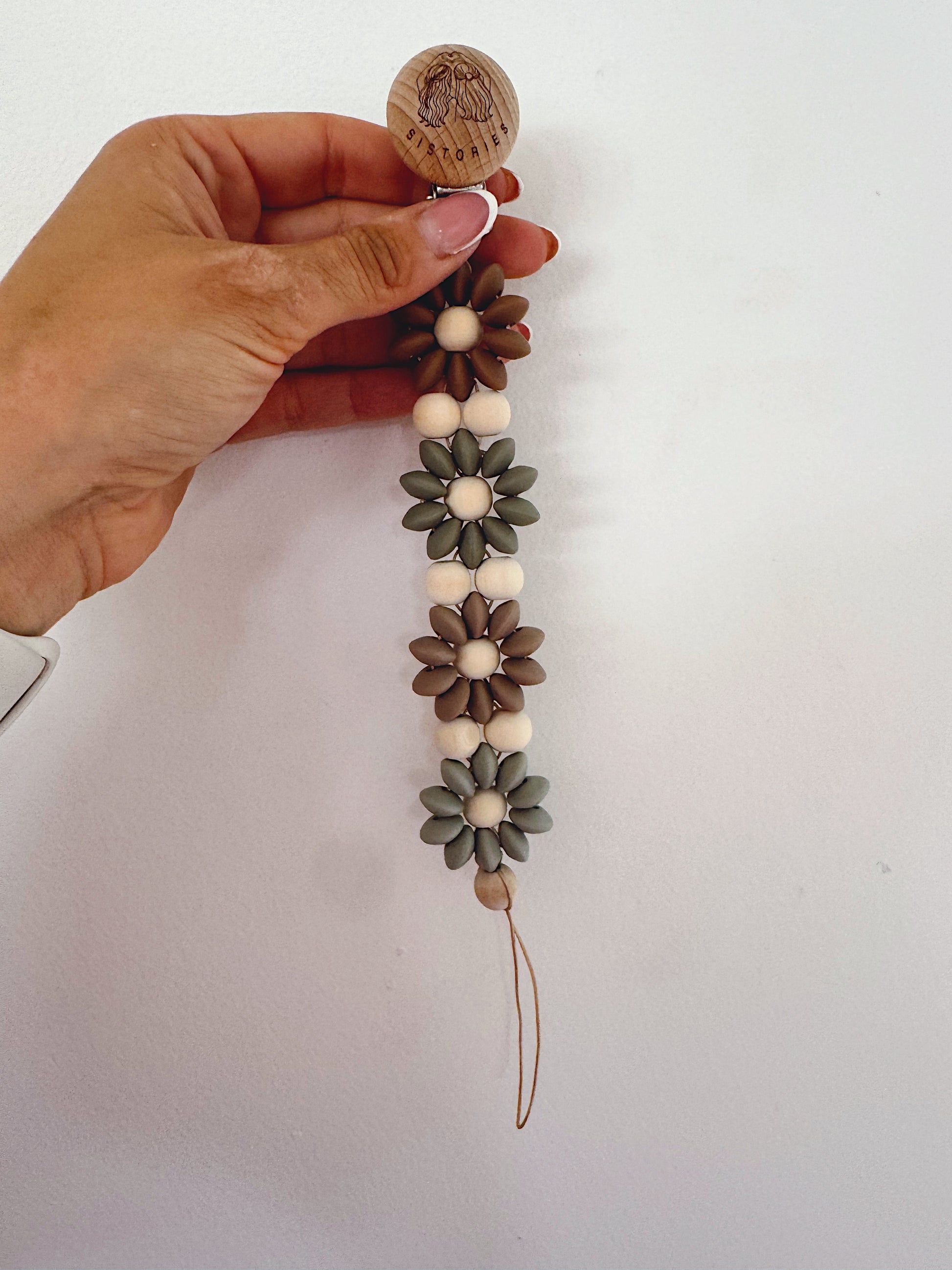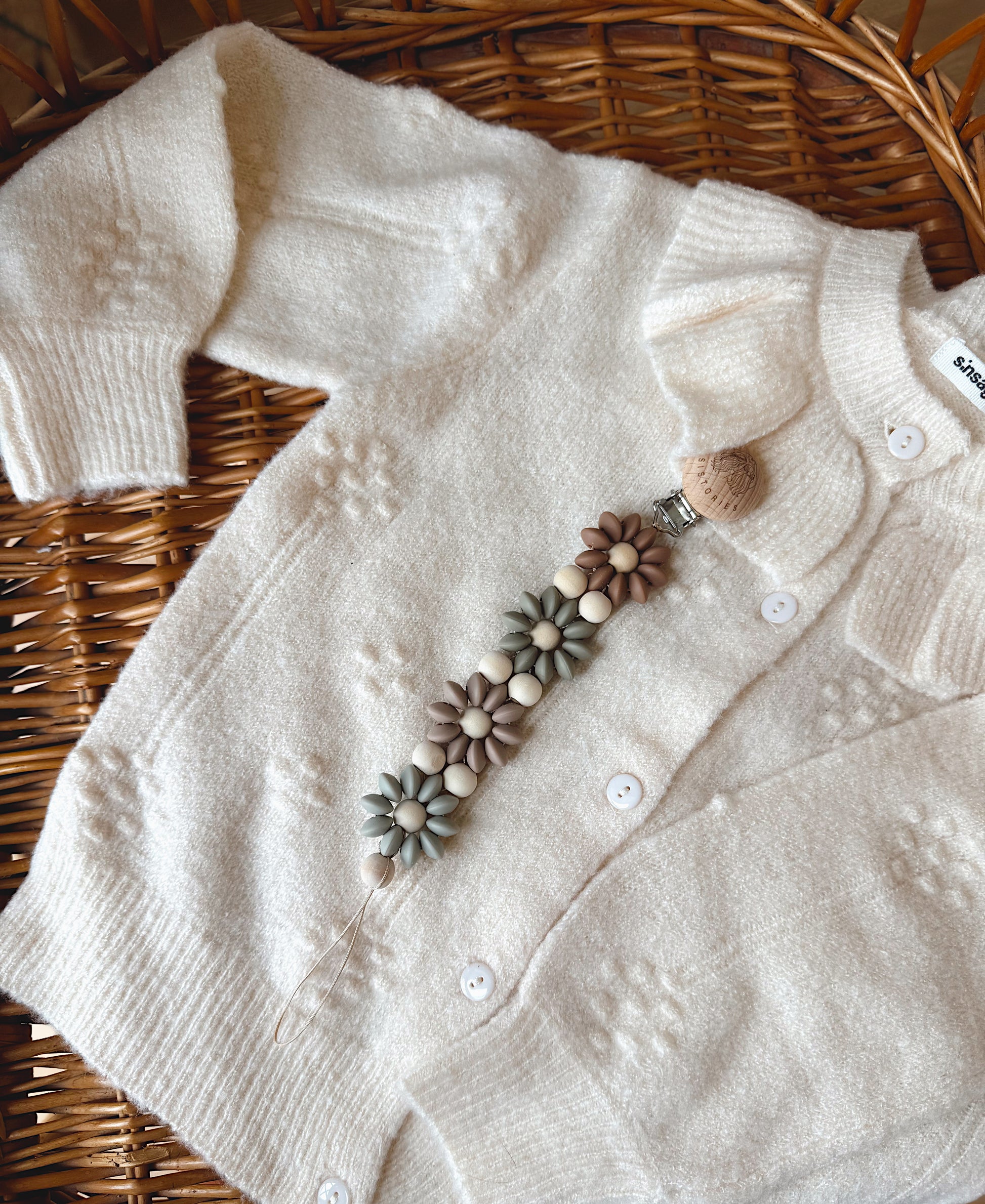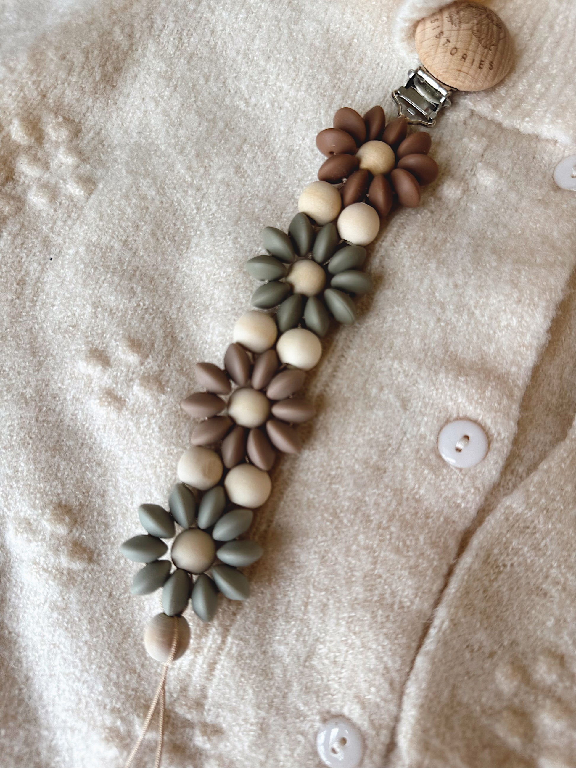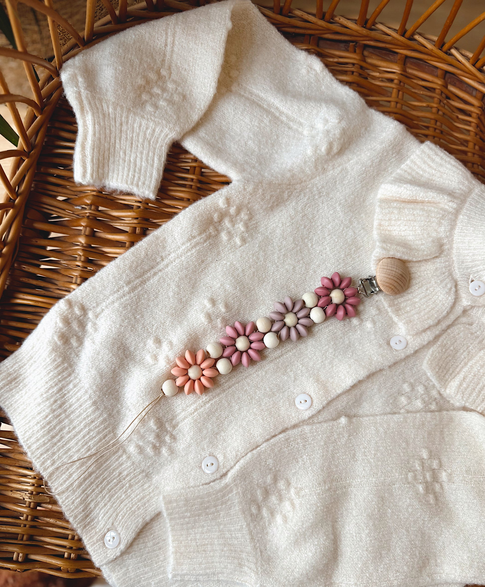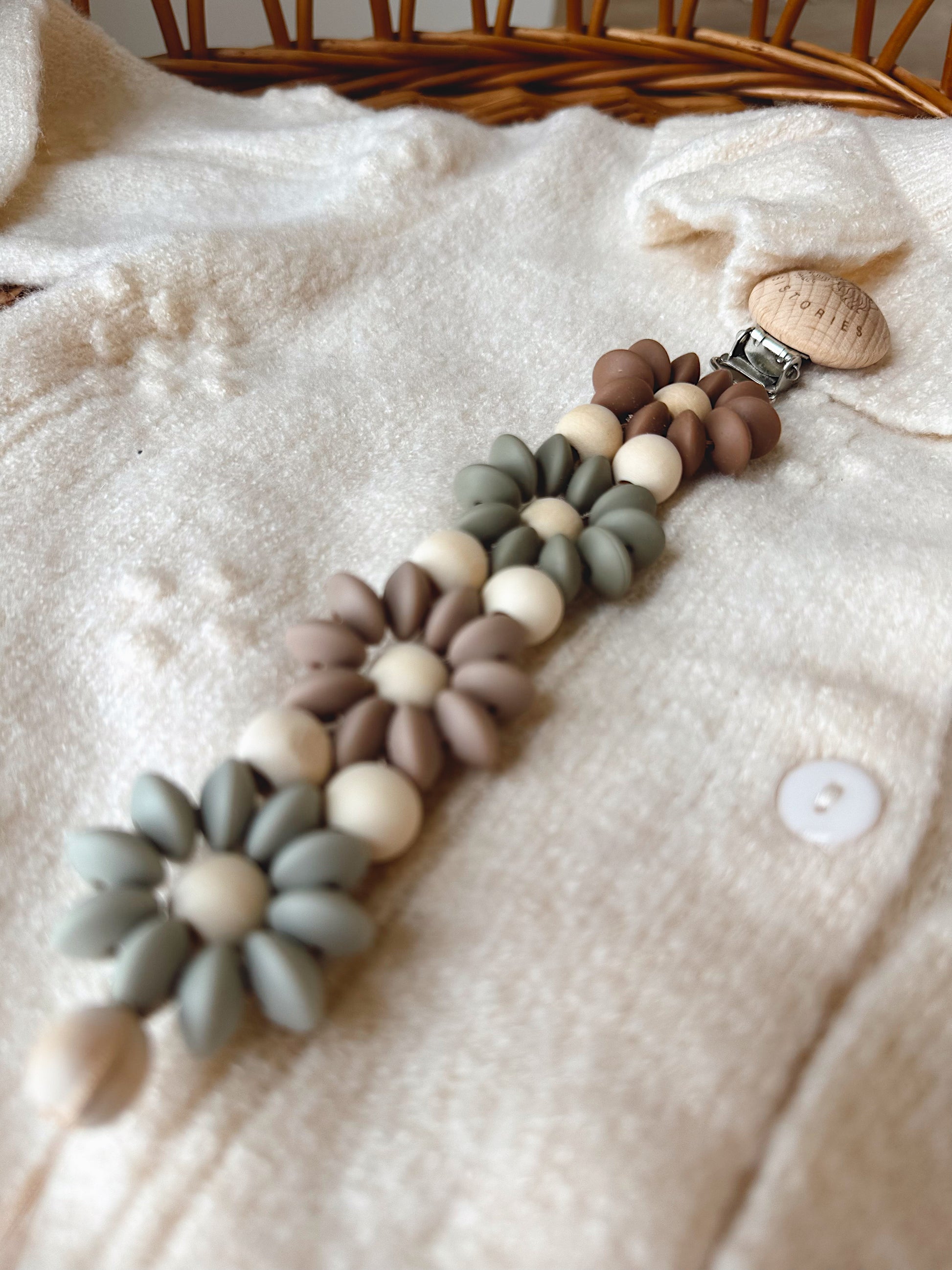 Klip na dudlík s kopretinou je ručně vyrobený přívěšek v kombinaci netoxických silikonových a dřevěných korálků. Stylový doplněk a zároveň praktický pomocník. Díky jemným barvám a přírodnímu dřevu se hodí ke každému outfitu i kočárku. Zabraňuje pádu dudlíku na zem a je ideální na procházky i doma.