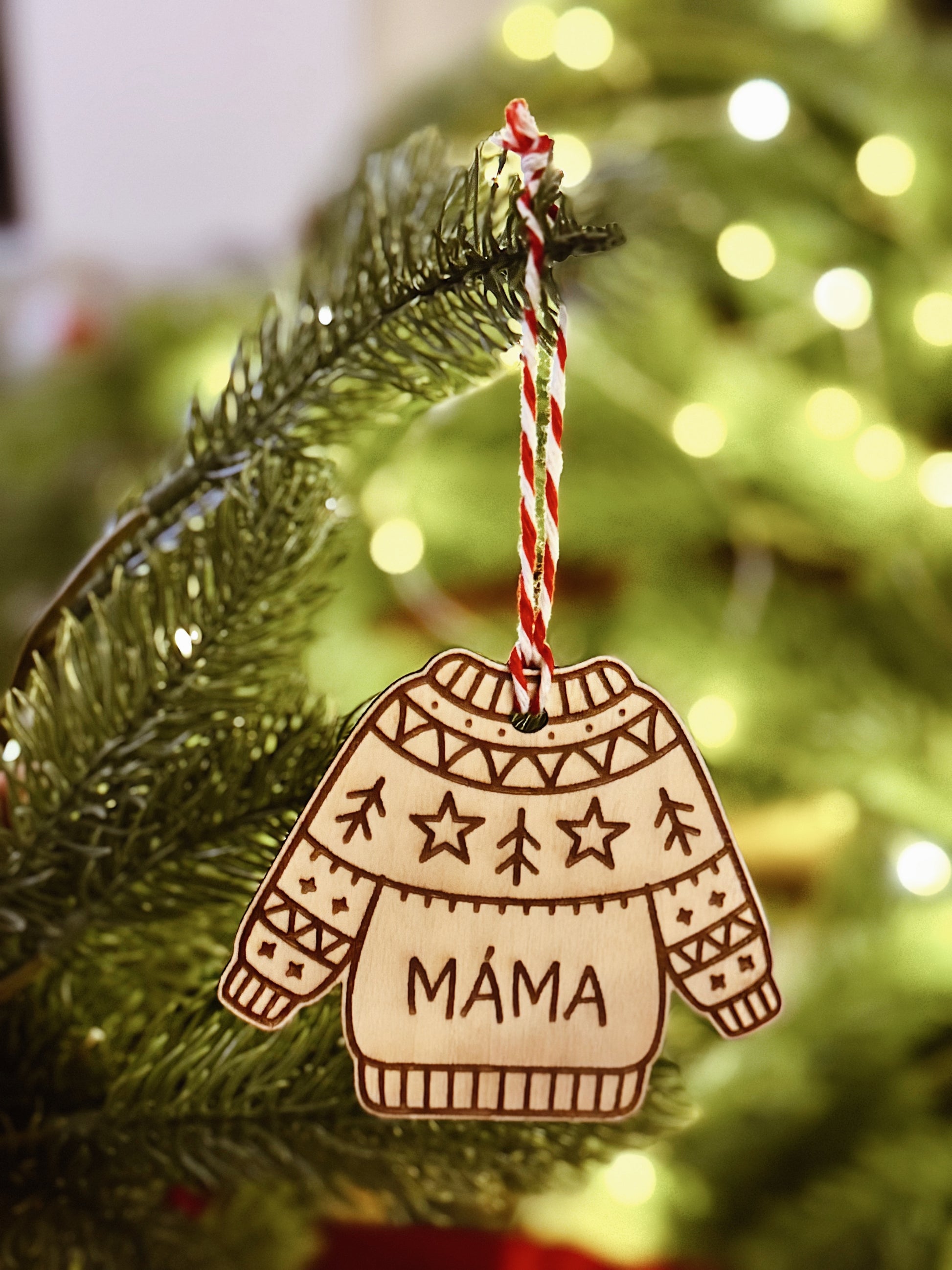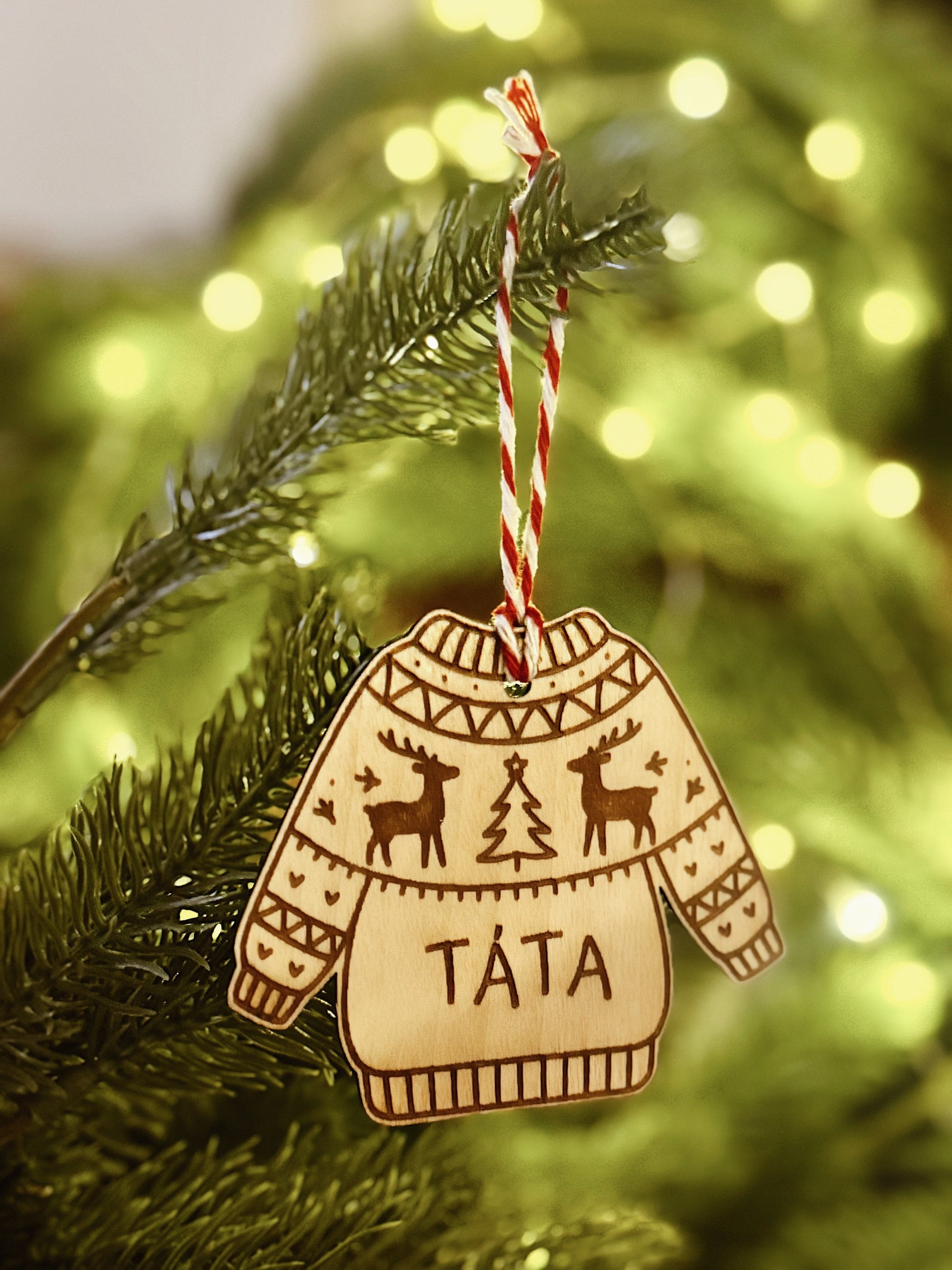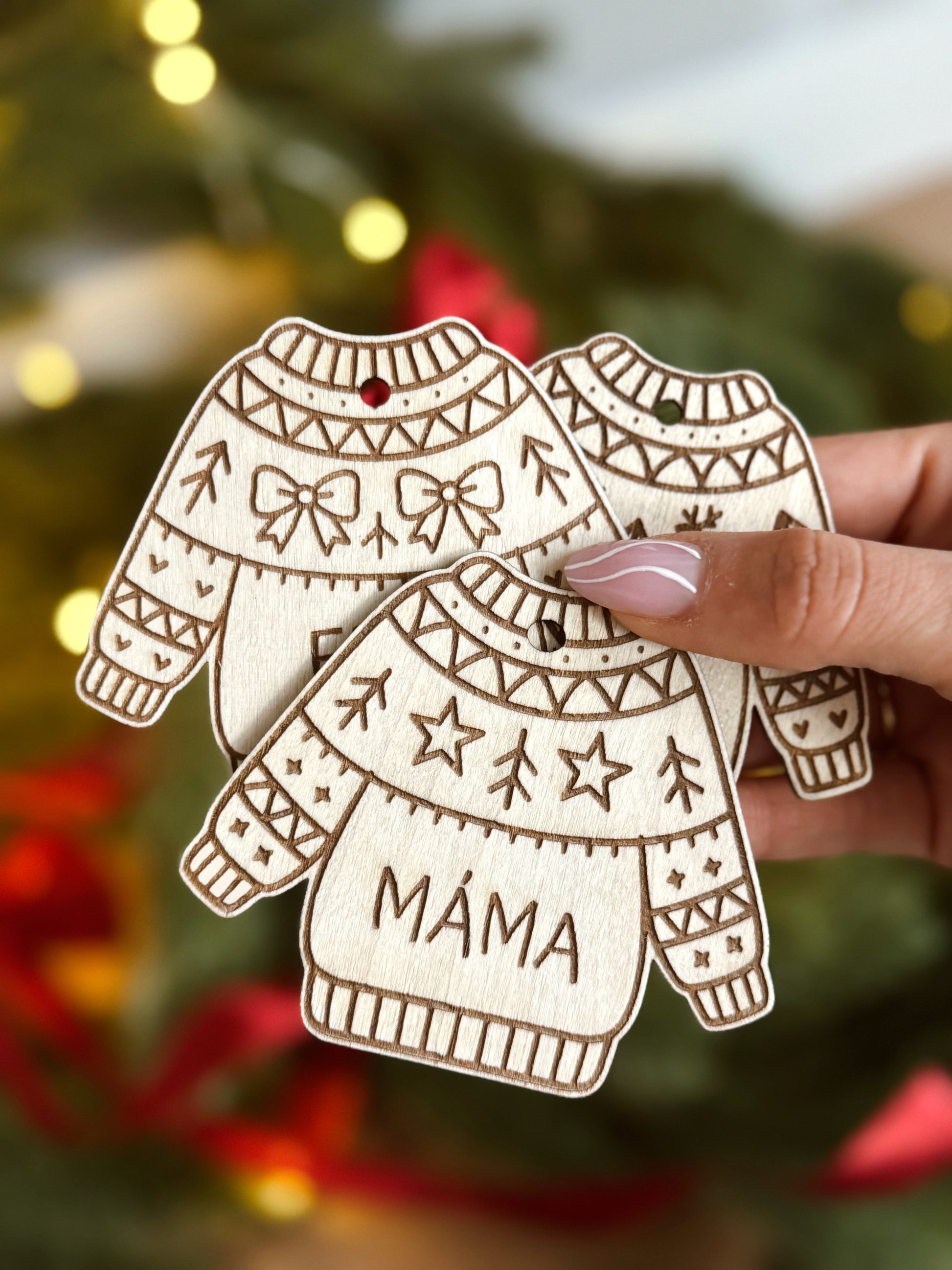 Dřevěná ozdoba ve tvaru svetru s personalizovaným nápisem. Vykouzlete si klidnou zimní atmosféru vašeho domova, lze ji použít na stromeček, jako jmenovku i jako malý dárek.