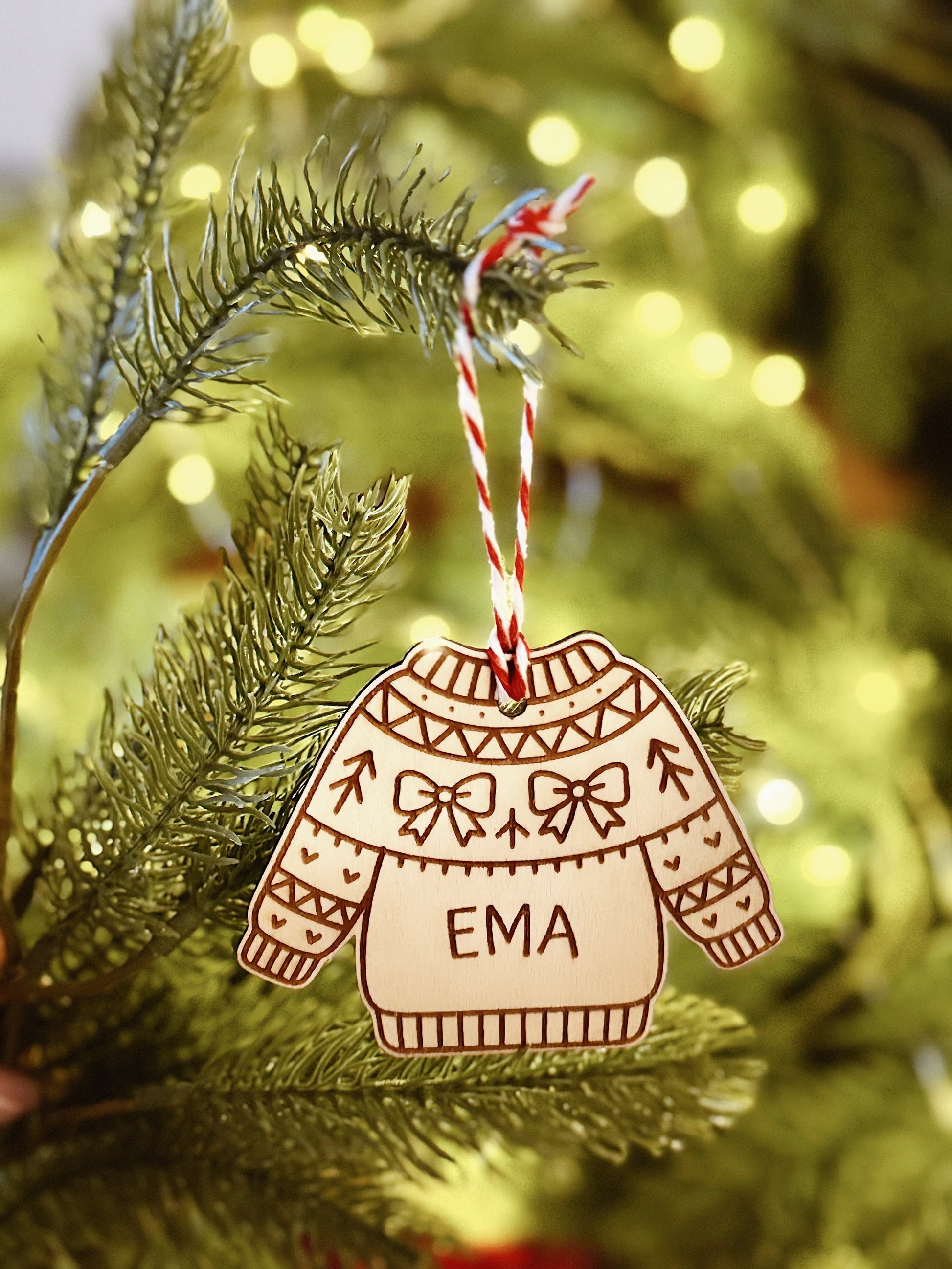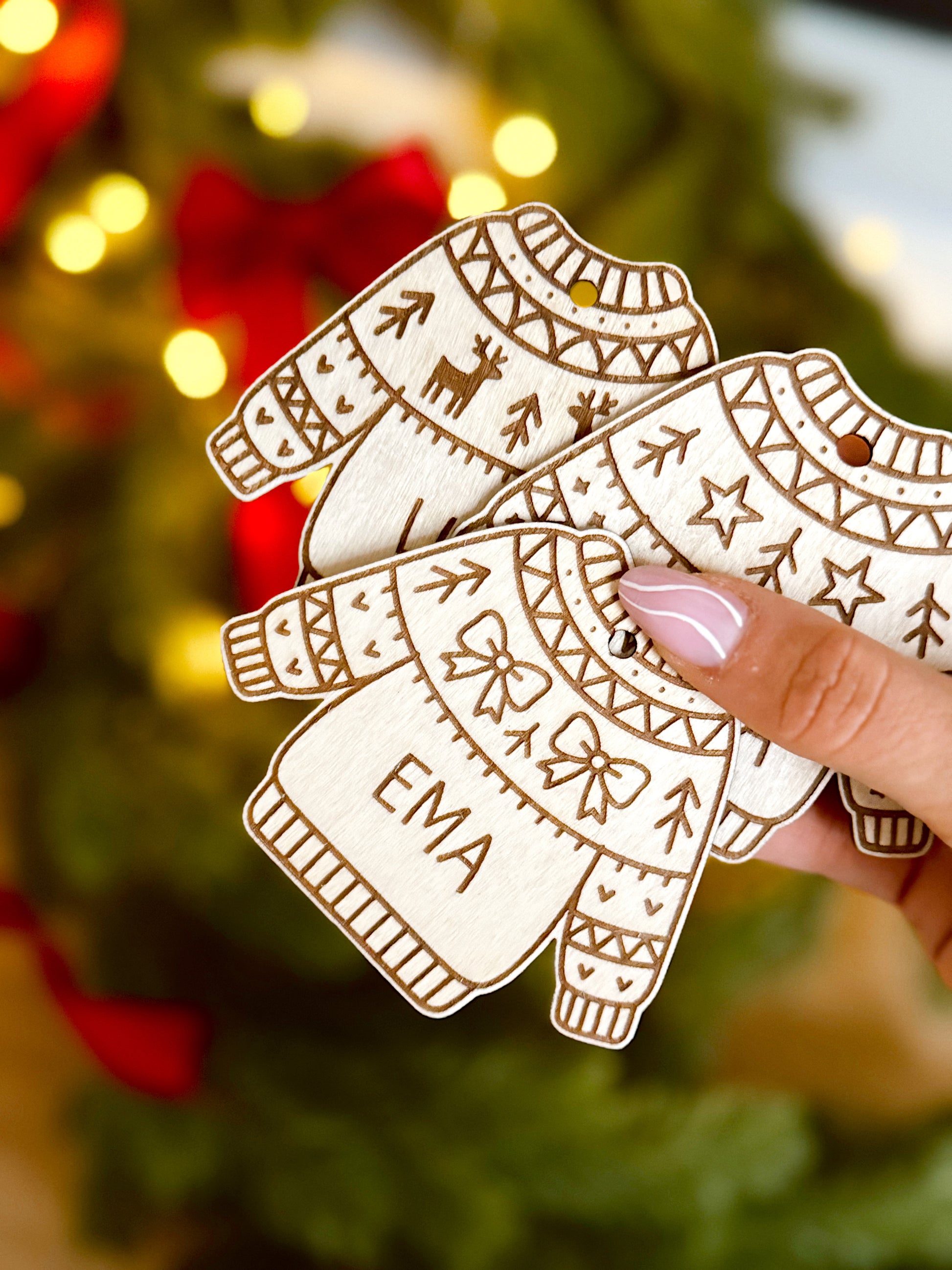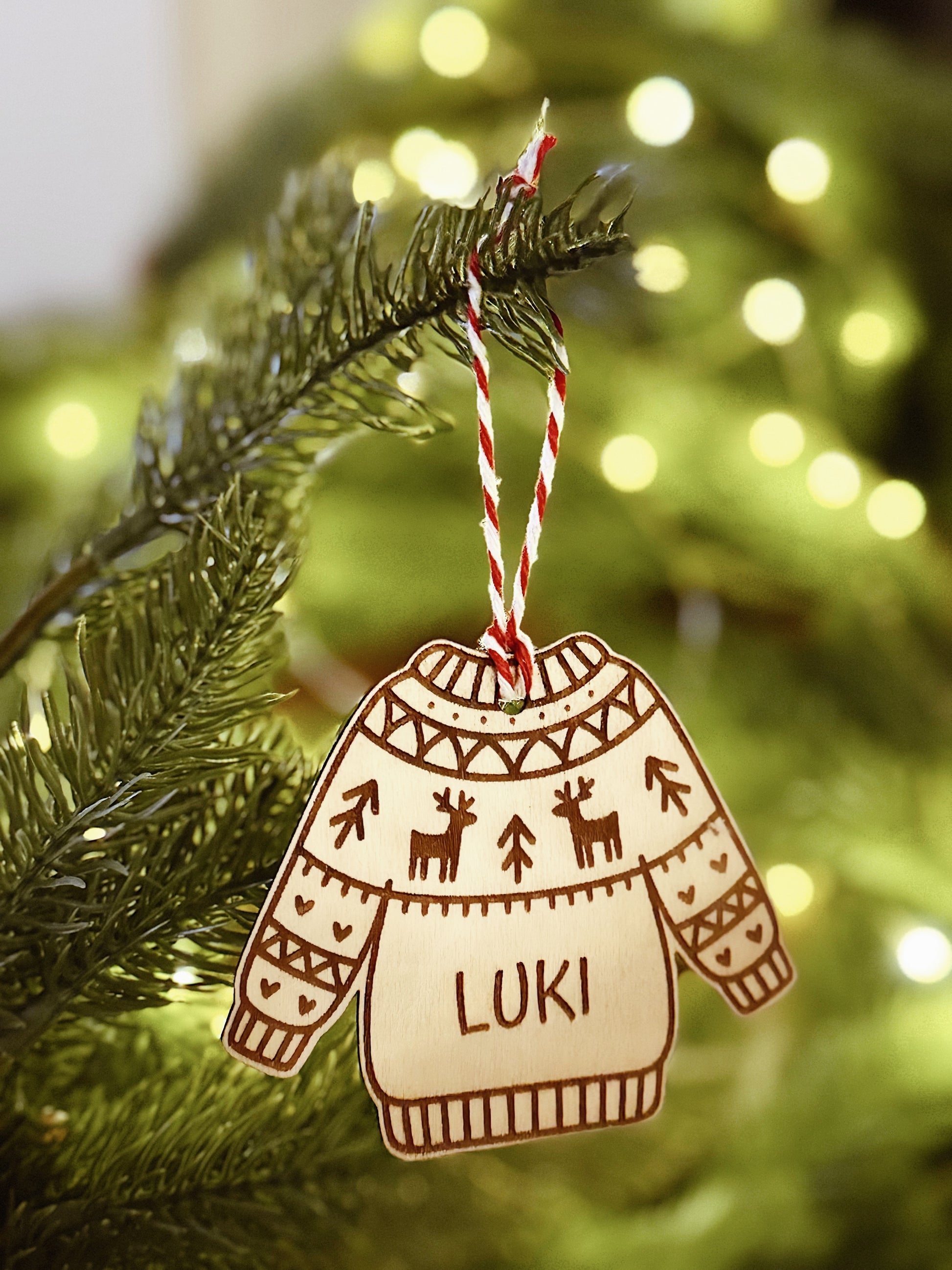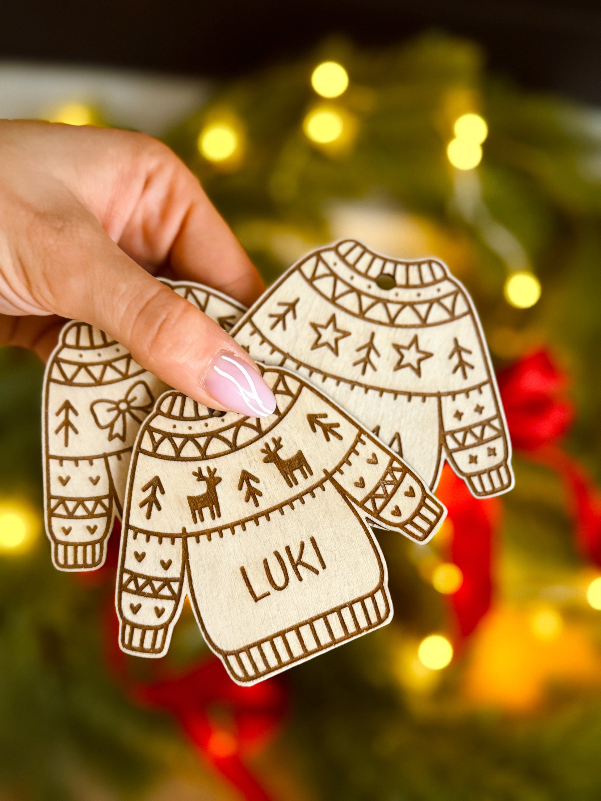 Dřevěná ozdoba ve tvaru svetru s personalizovaným nápisem. Vykouzlete si klidnou zimní atmosféru vašeho domova, lze ji použít na stromeček, jako jmenovku i jako malý dárek.