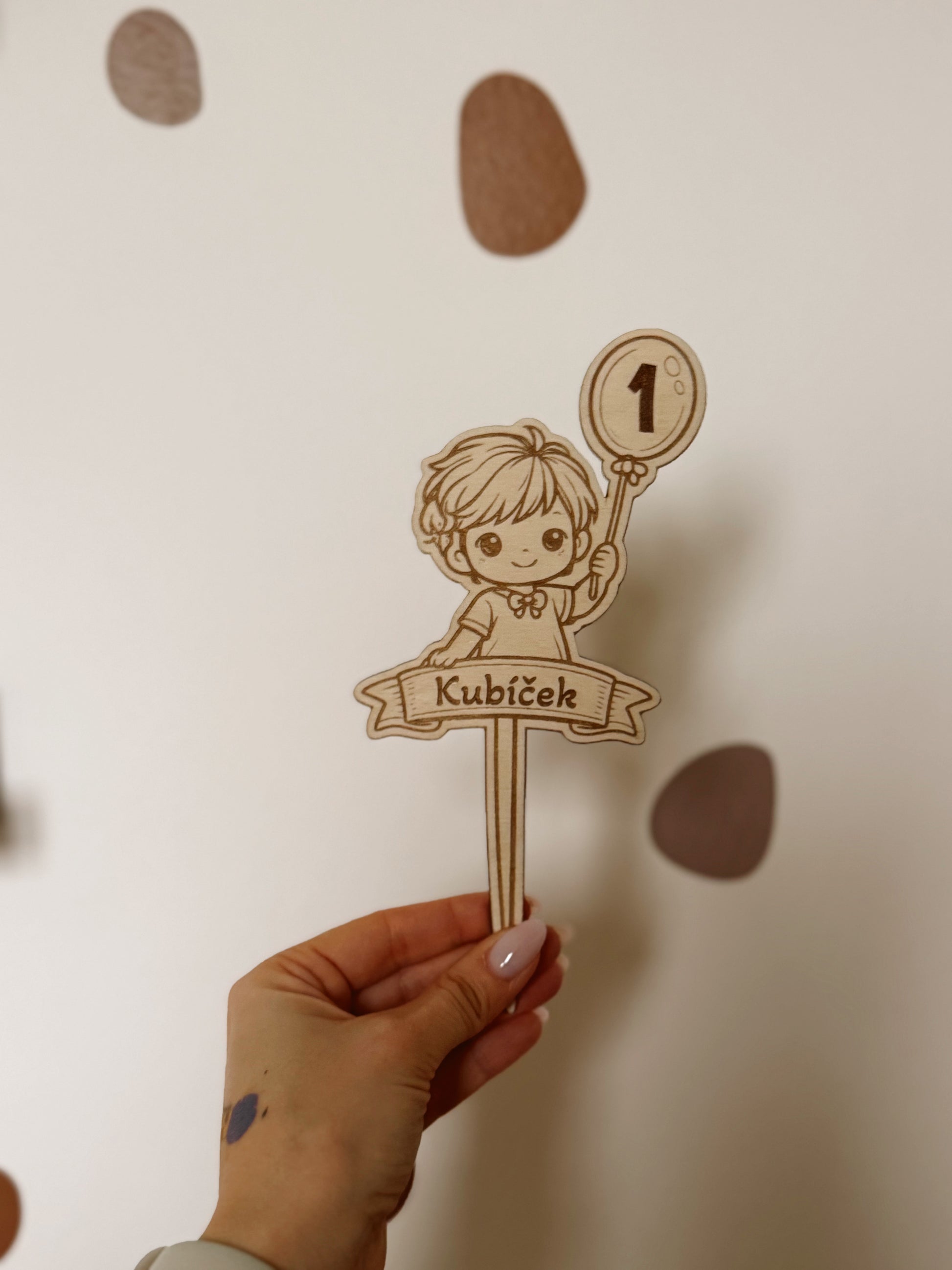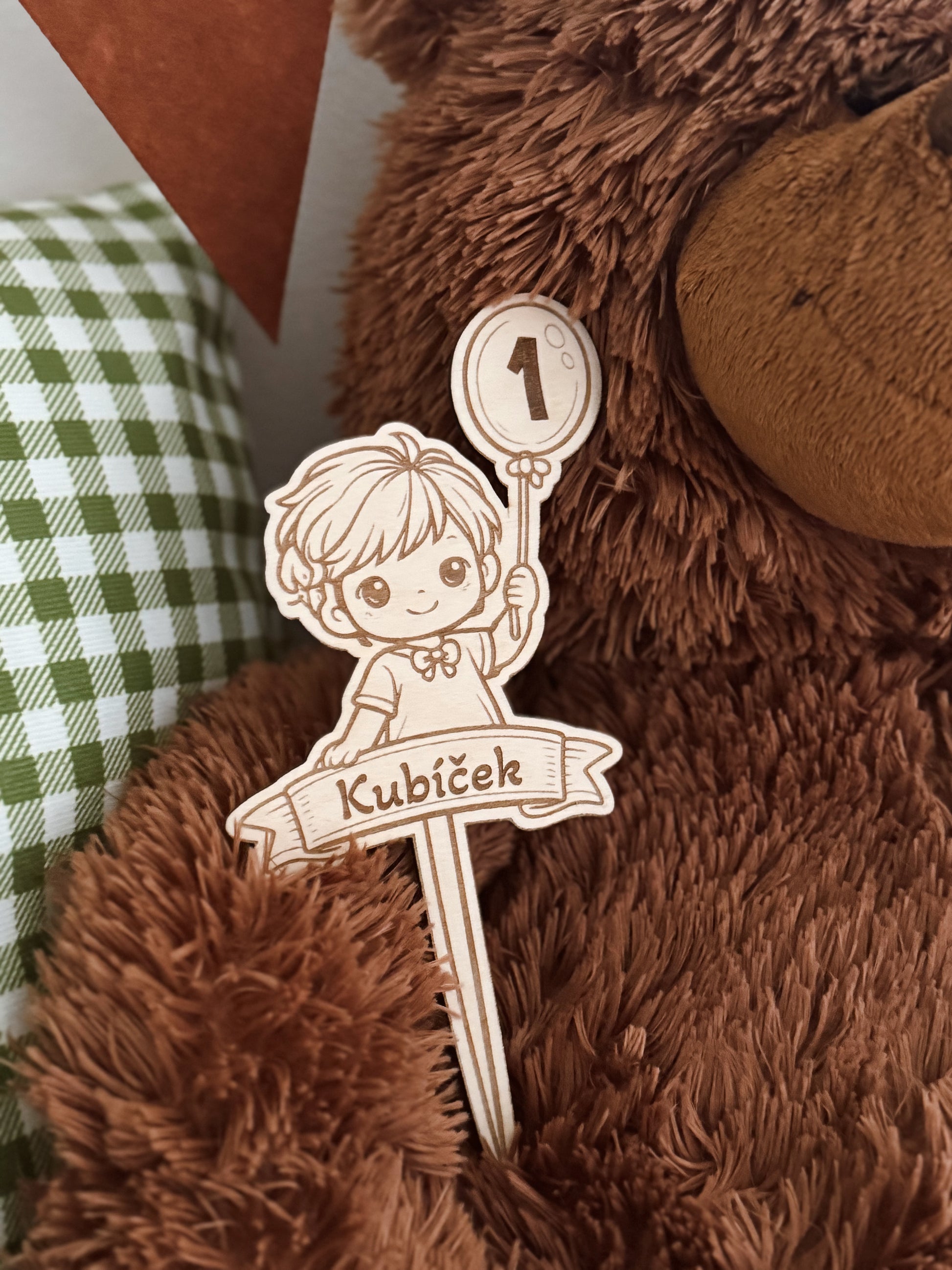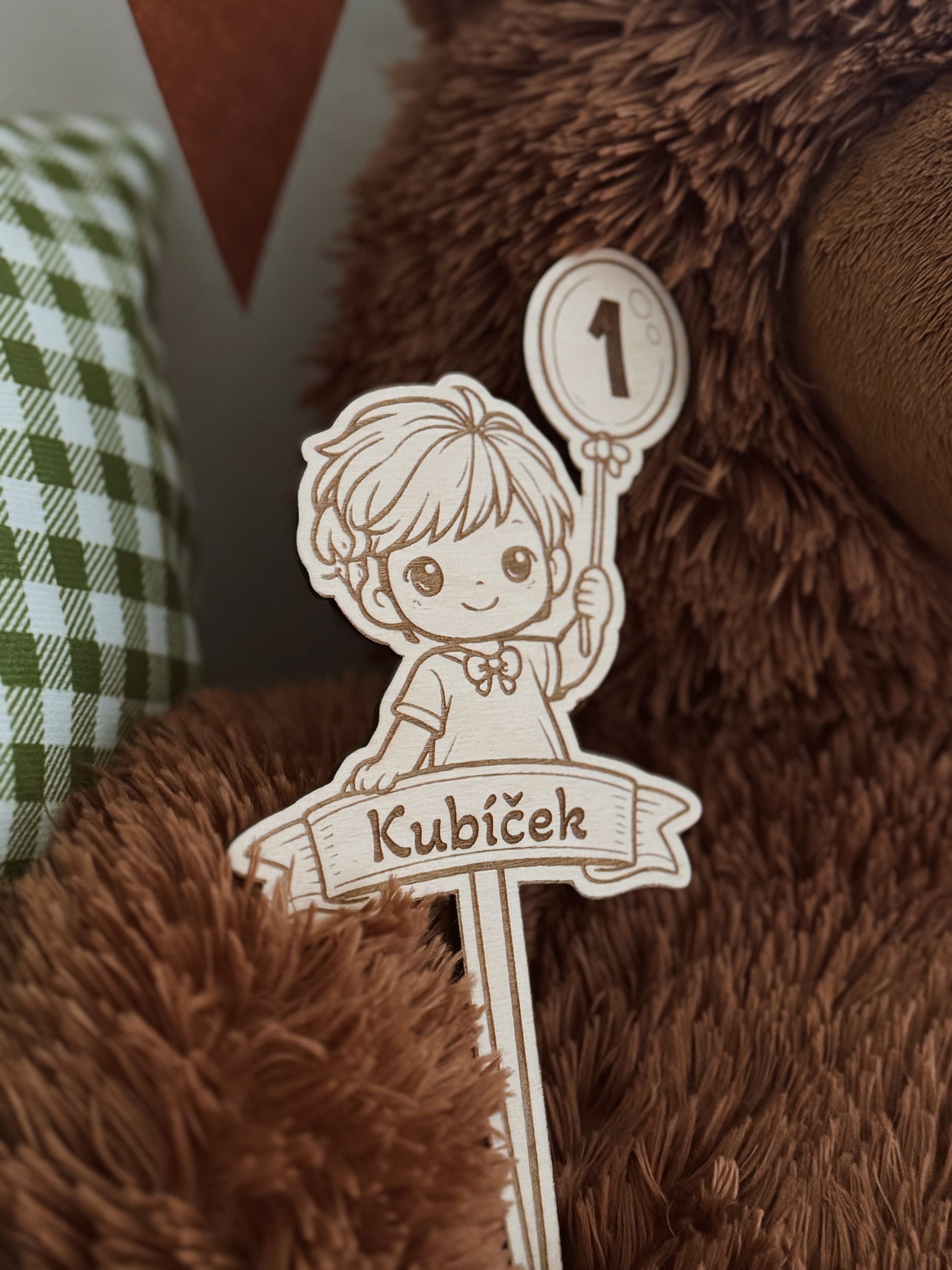 Originální dřevěný zápich na dort s motivem Chlapec, který se stane milou vzpomínkou na narozeniny! Po oslavě si jej dítě může vybarvit a uchovat jako upomínku. Vytvořte tradici – každý rok nový zápich, každý rok nová vzpomínka.